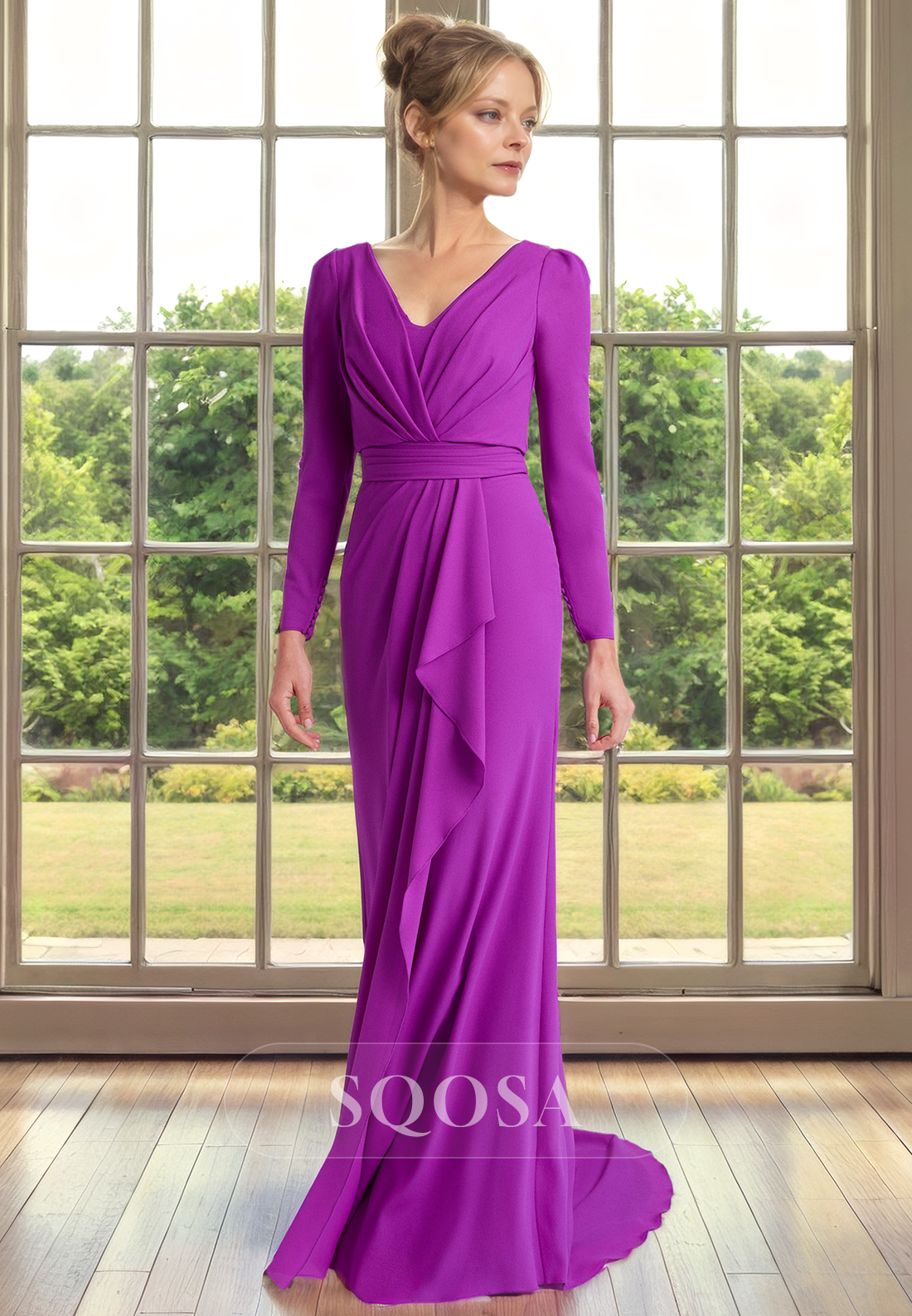 Sheath V Neck Pleats Long Sleeves Mother of the Bride Dress for Wedding Cocktail Dress
