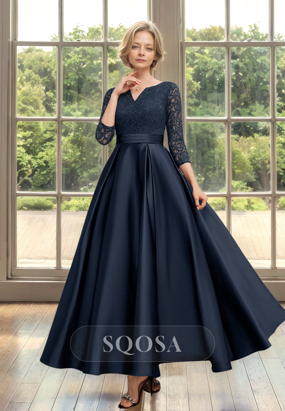 A-Line V-neck Long-Sleeves Satin Cocktail Gowns Pleated Lace Applique Beaded Cutout Mother of the Bride Dress