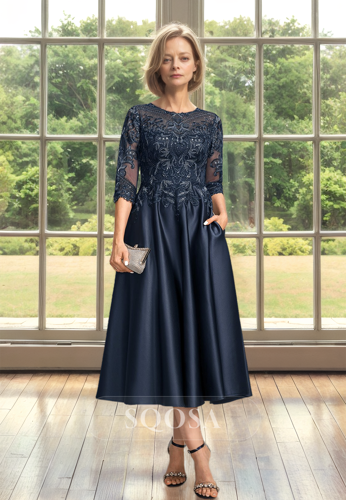 3/4 Sleeves Scoop-Neck Applique A-Line Mother of the Bride Dress Pleated Beaded Cutout Satin Cocktail Gowns