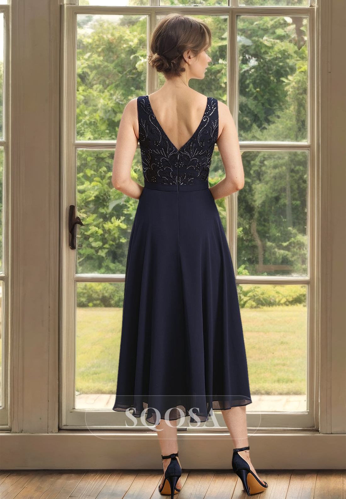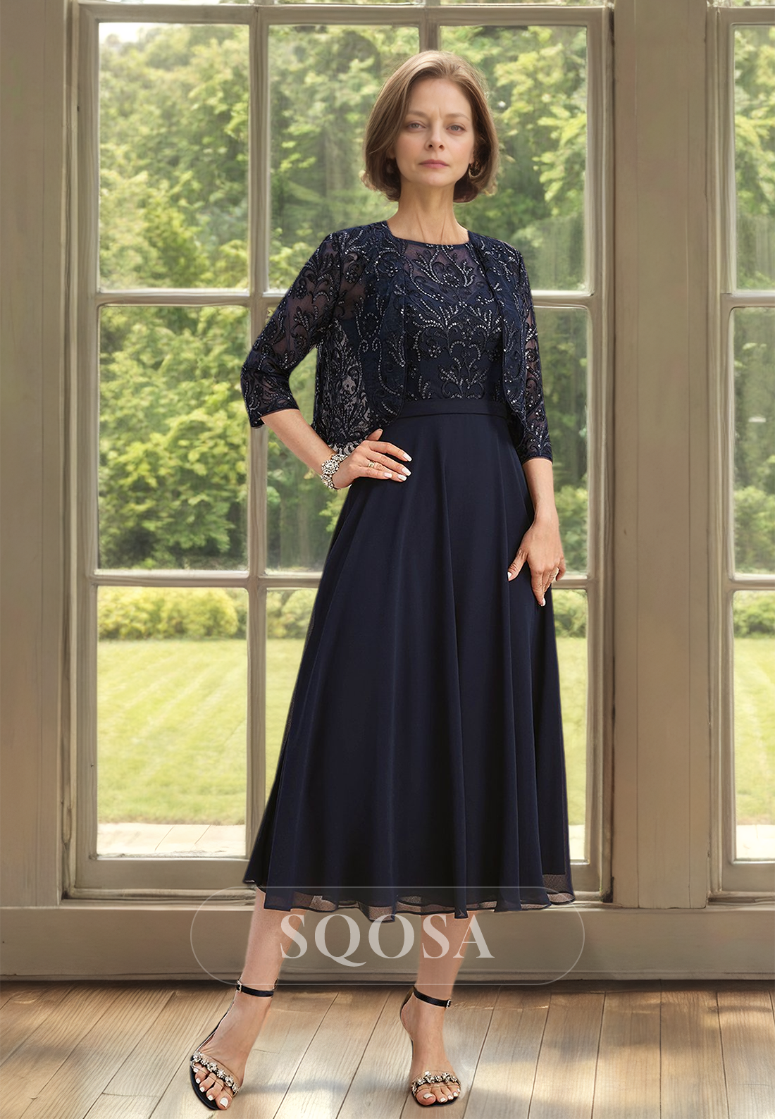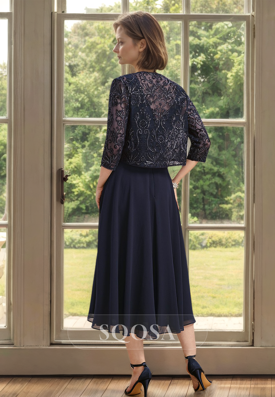 Scoop-Neck Chiffon A-Line Pleated Beaded Cutout Mother of the Bride Dress with Lace Applique Coat
