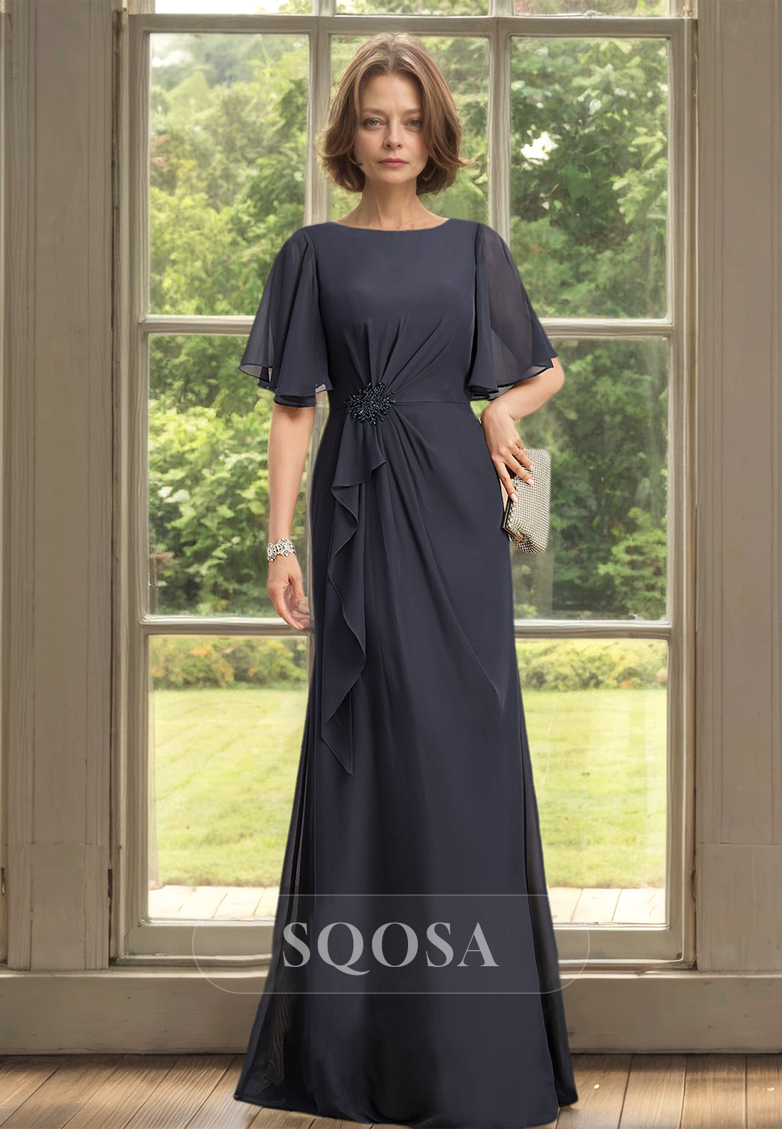 Stay stylish and comfortable on your daughter's big day with our Half-Sleeveless Scoop-Neck Fitted Mother of the Bride Dress. The pleated and beaded chiffon fabric adds an elegant touch, while the fitted design flatters your figure. Perfect for a sophisticated cocktail hour, you'll feel confident and beautiful in this dress.