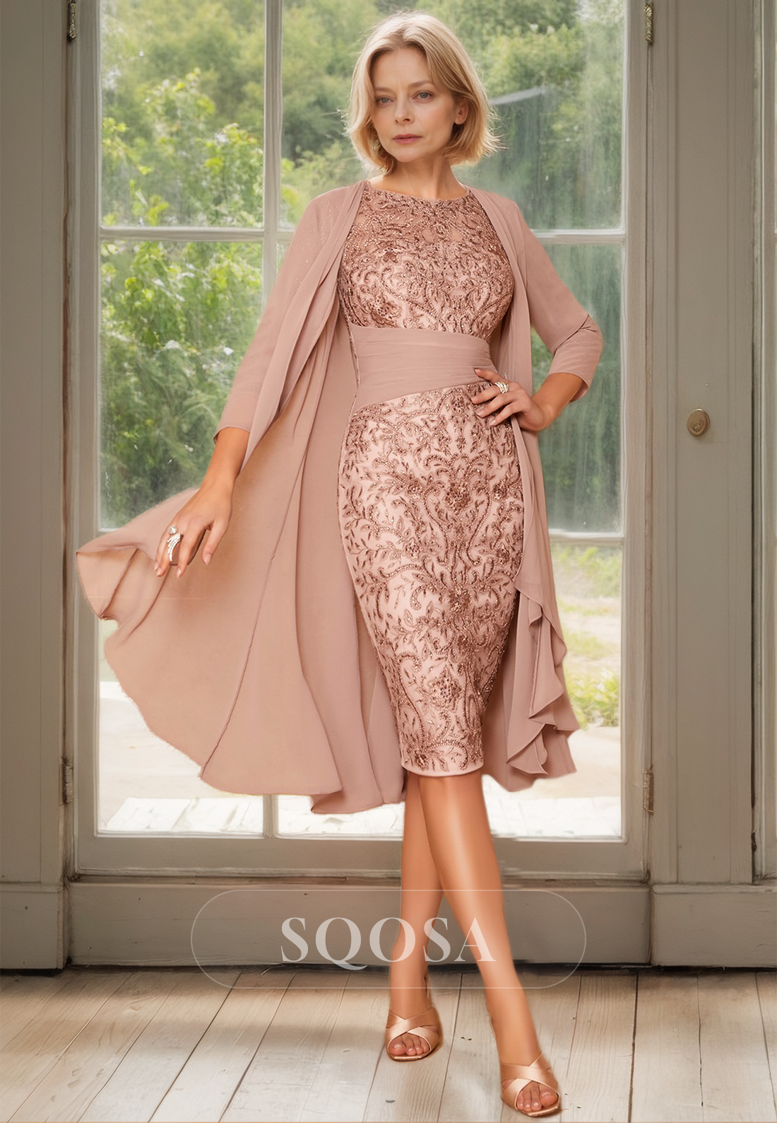 Scoop-Neck Half-Sleeves Beaded Mermaid Mother of the Bride Dress Allover Lace Applique Cocktail Gowns with Overlay