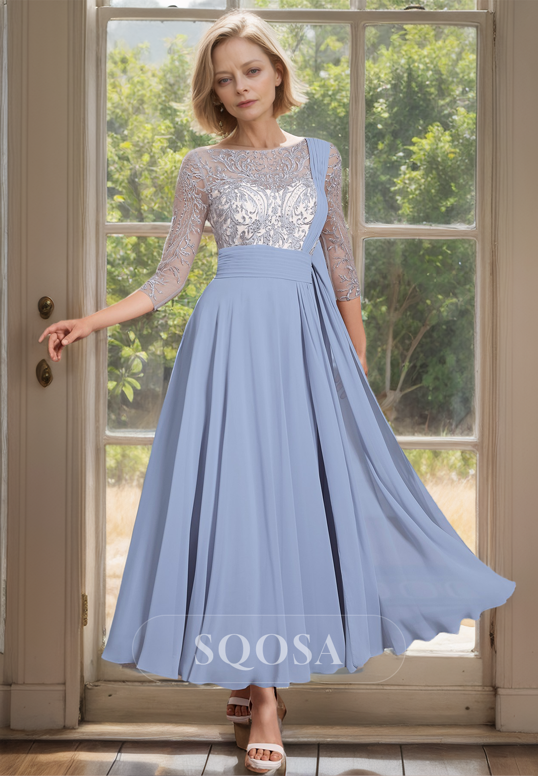 Scoop-Neck Long-Sleeves Chiffon A-Line Mother of the Bride Gowns Lace Applique Beaded Sheer Cocktail Dress