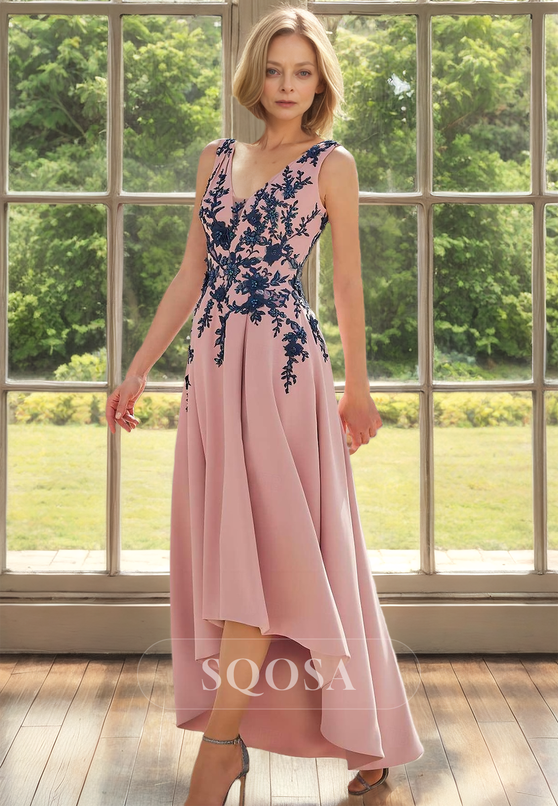V-Neck Straps Sleeveless Cocktail Gowns Beaded Applique Floor-Length High-Low Mother of the Bride Dress x 1;
