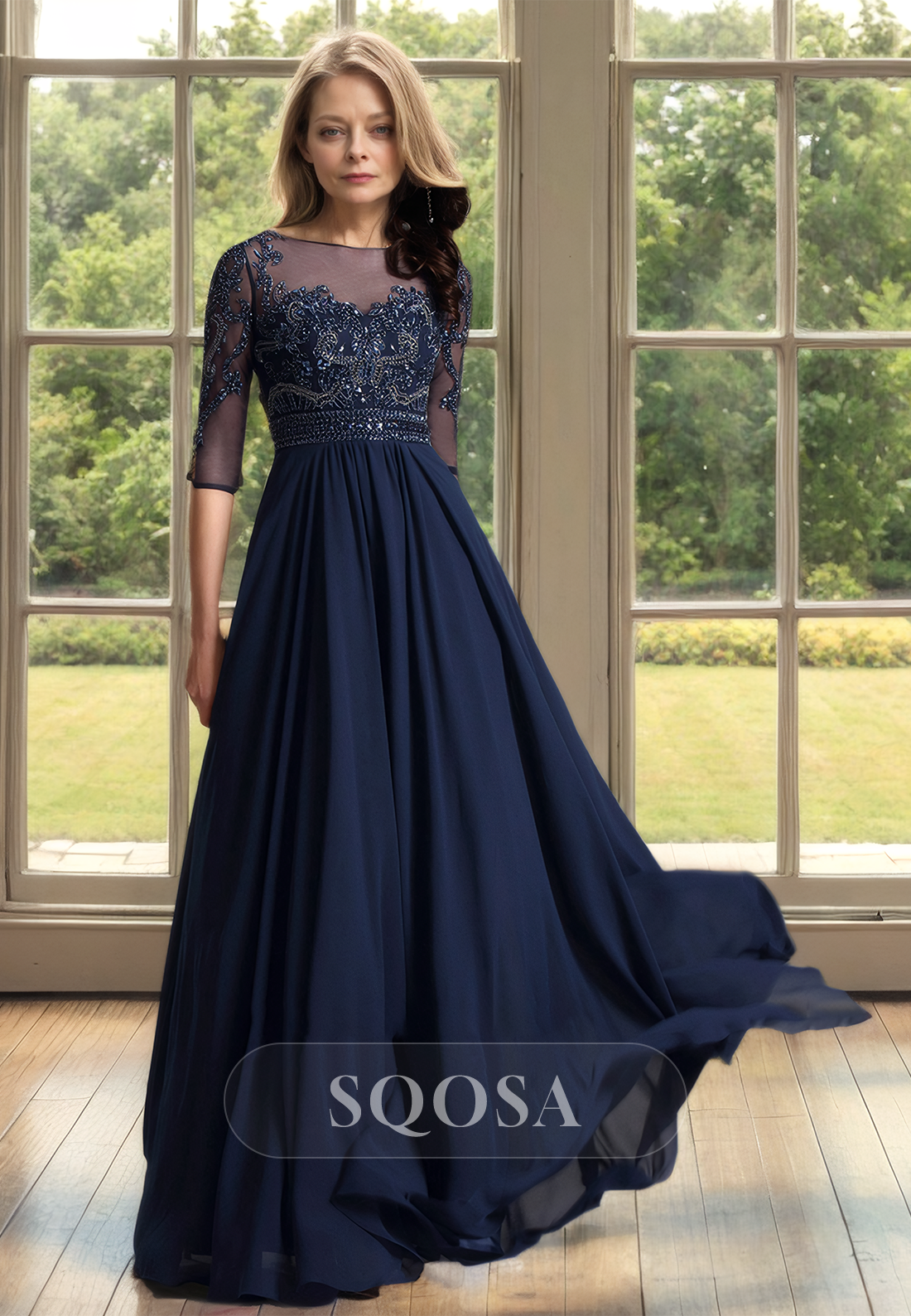 A-Line Half-Sleeves Beaded Mother of the Bride Dress Scoop-Neck Sheer Floor-Length Cocktail Gowns
