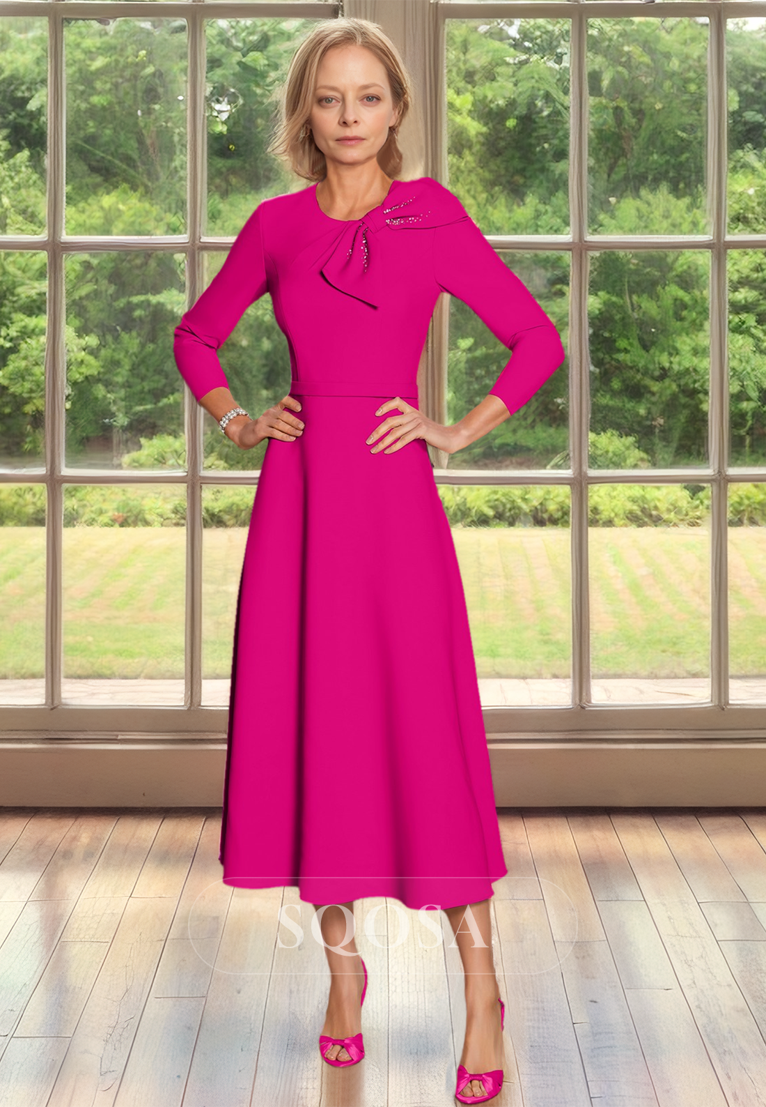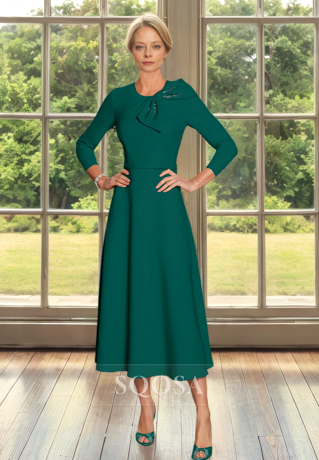 A-Line Long-Sleeves Midi Cocktail Gowns Scoop-Neck Beaded Mother of the Bride Dress with Bow