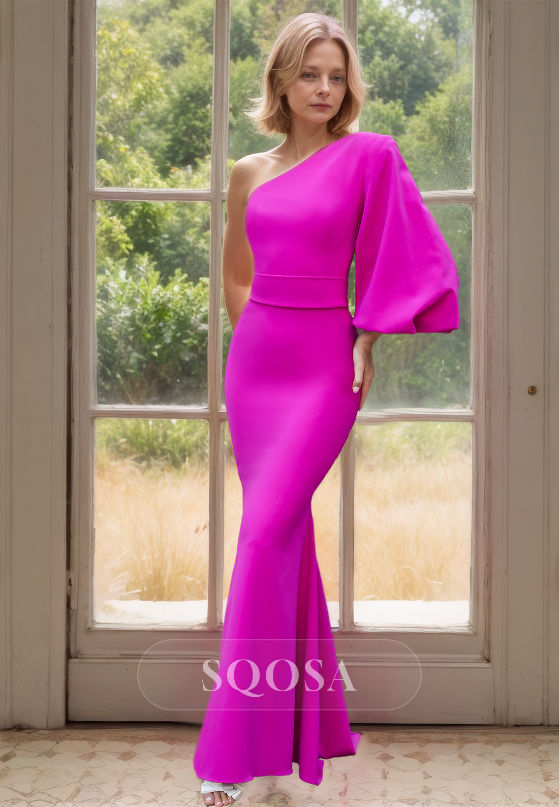 Asymmetrical-Neck One-Puff-Sleeve Off-Shoulder Floor-Length Satin Mermaid Mother of the Bride Dress