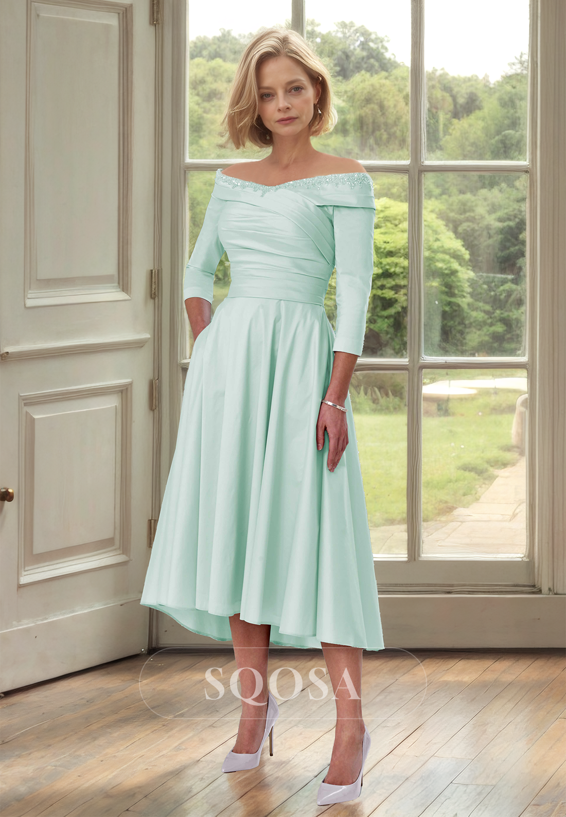 Beaded Tube Top Long-Sleeves Cocktail Gowns Pleated Midi A-Line Mother of the Bride Dress