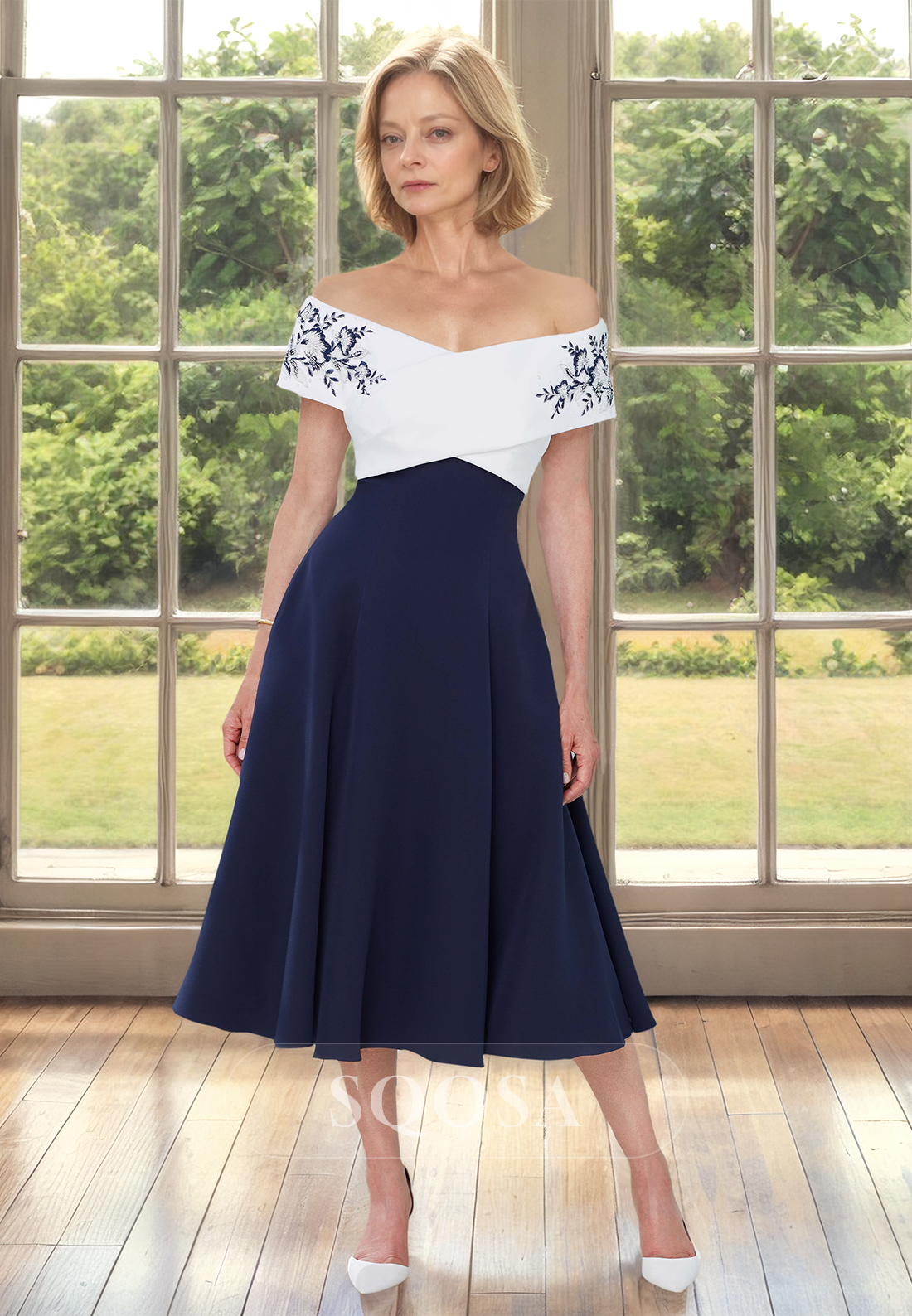 Tube Top Off-Shoulder Sleeveless Pleated Applique Two Tone Midi A-Line Mother of the Bride Dress