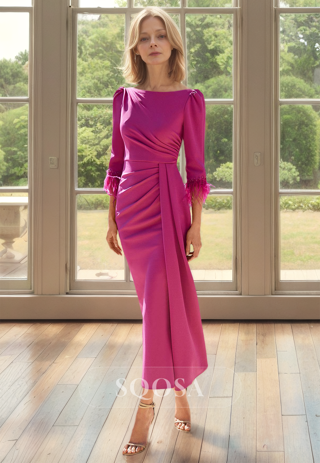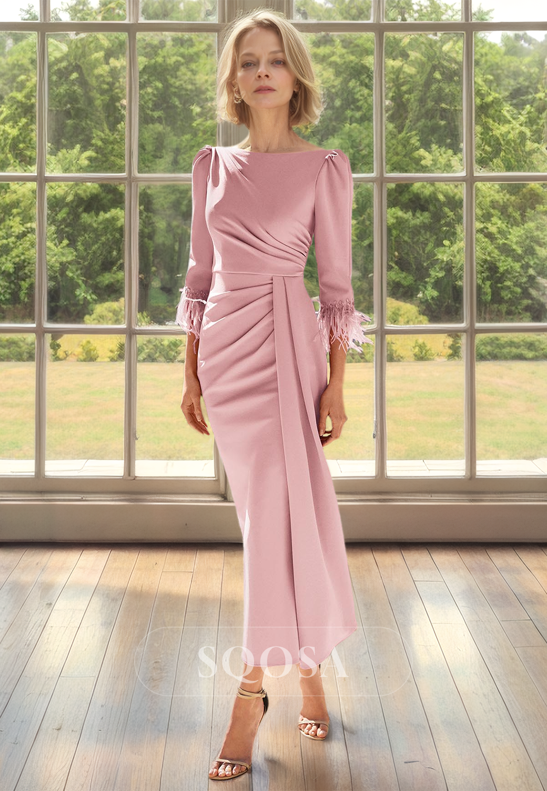 Fringed Half-Sleeves Scoop-Neck Mermaid Mother of the Bride Dress Pleated Satin Midi Cocktail Gowns x 1;
