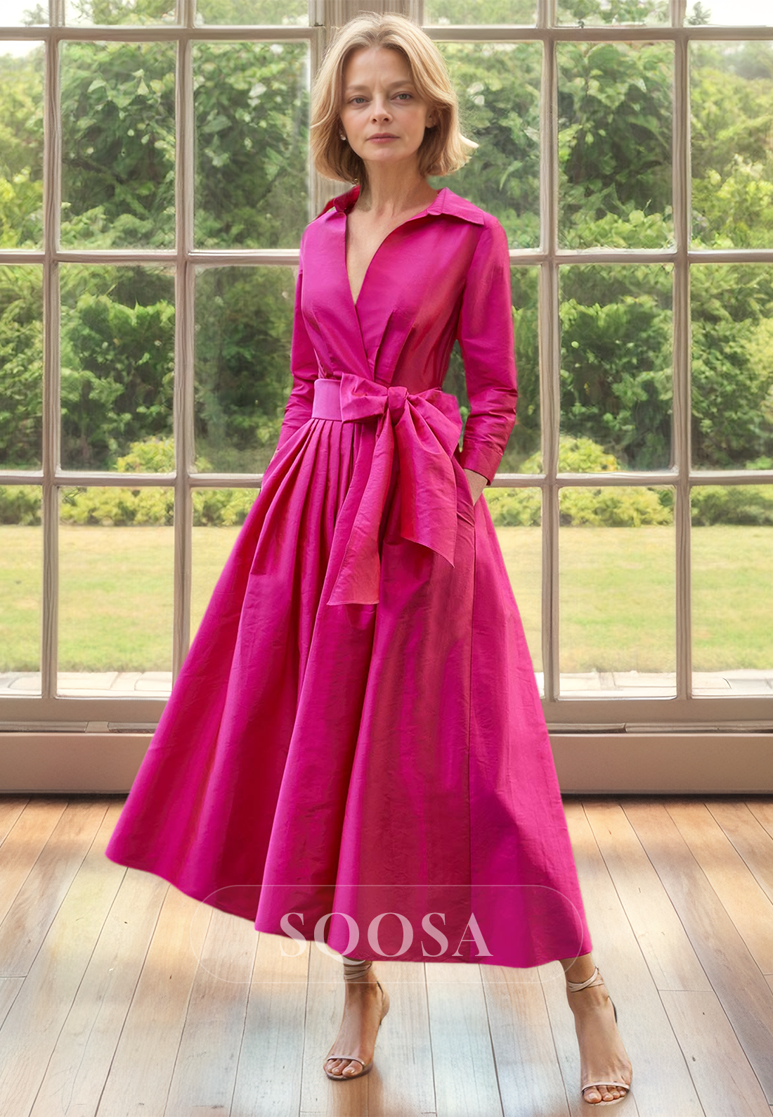 Collar V-Neck Long-Sleeves Midi Cocktail Gowns Pleated A-Line Mother of the Bride Dress with Bow