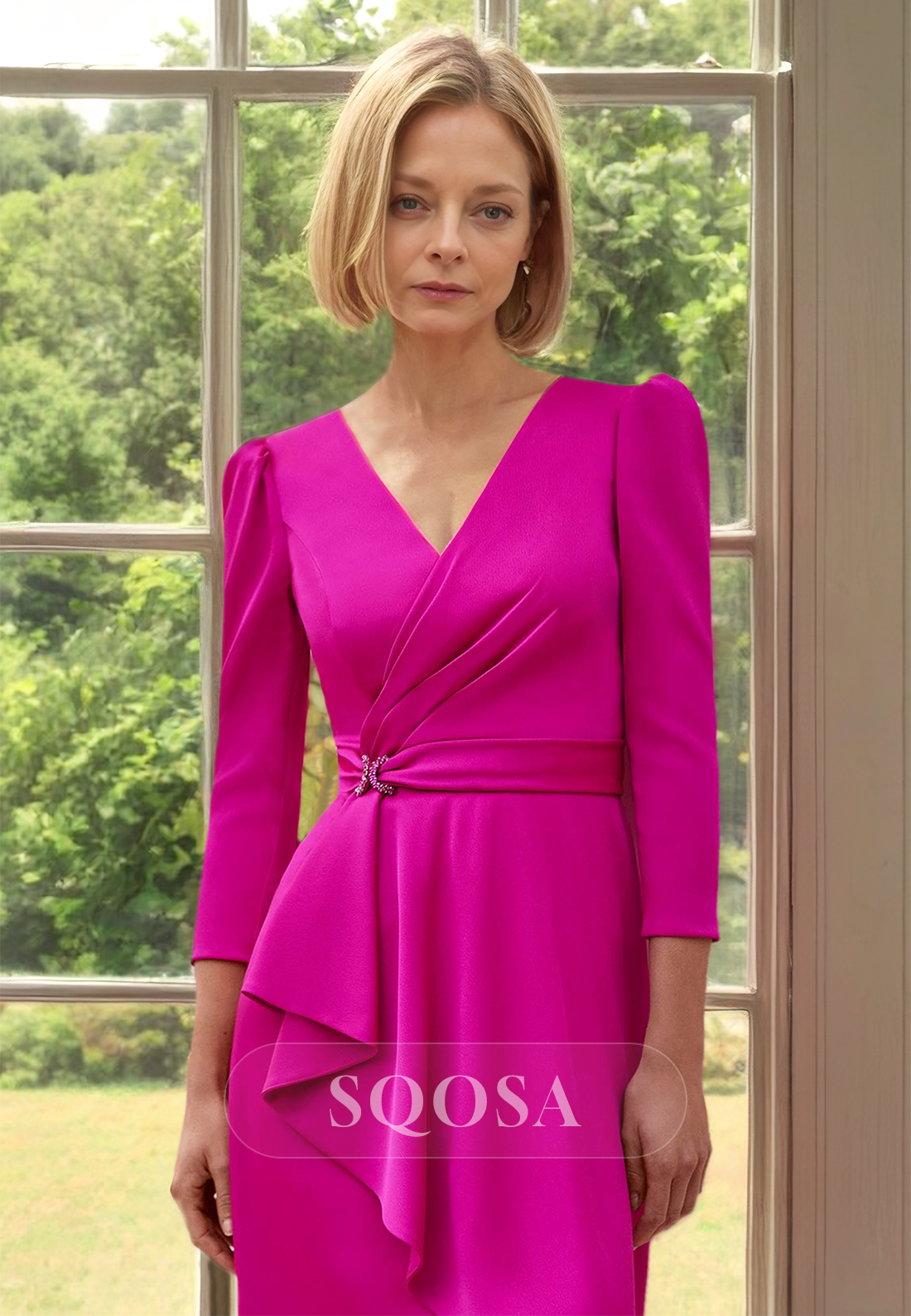 V-Neck Long-Sleeves High-Low Midi Mother of the Bride Dress Pleated Beaded Chiffon Cocktail Gowns