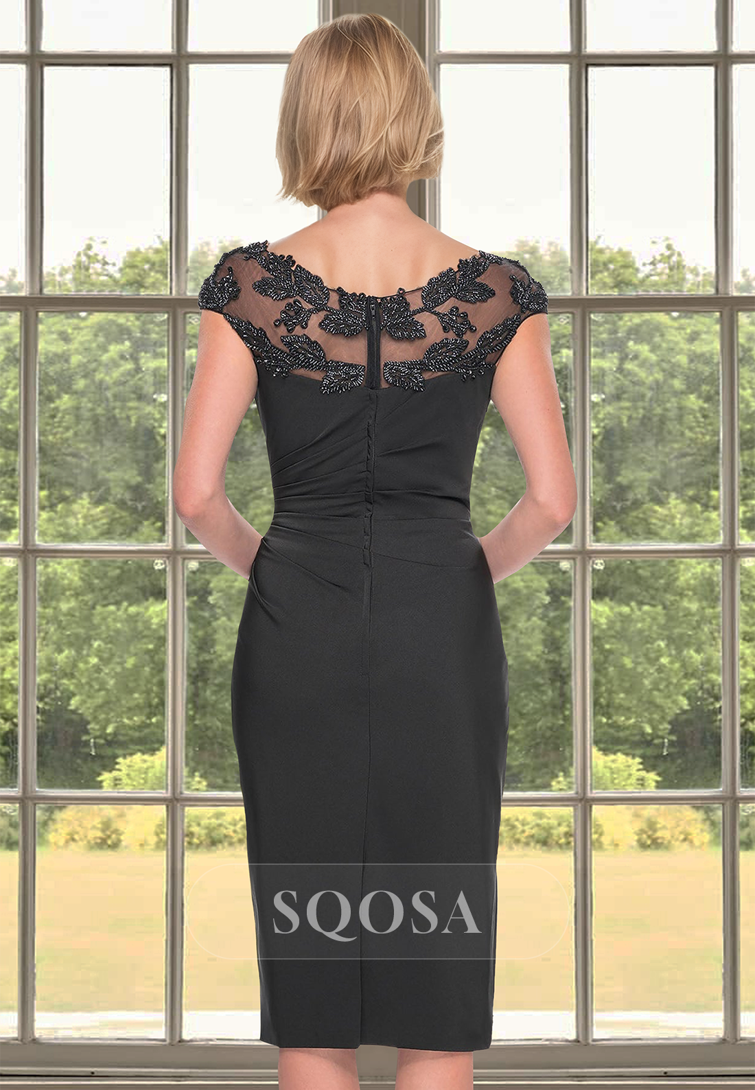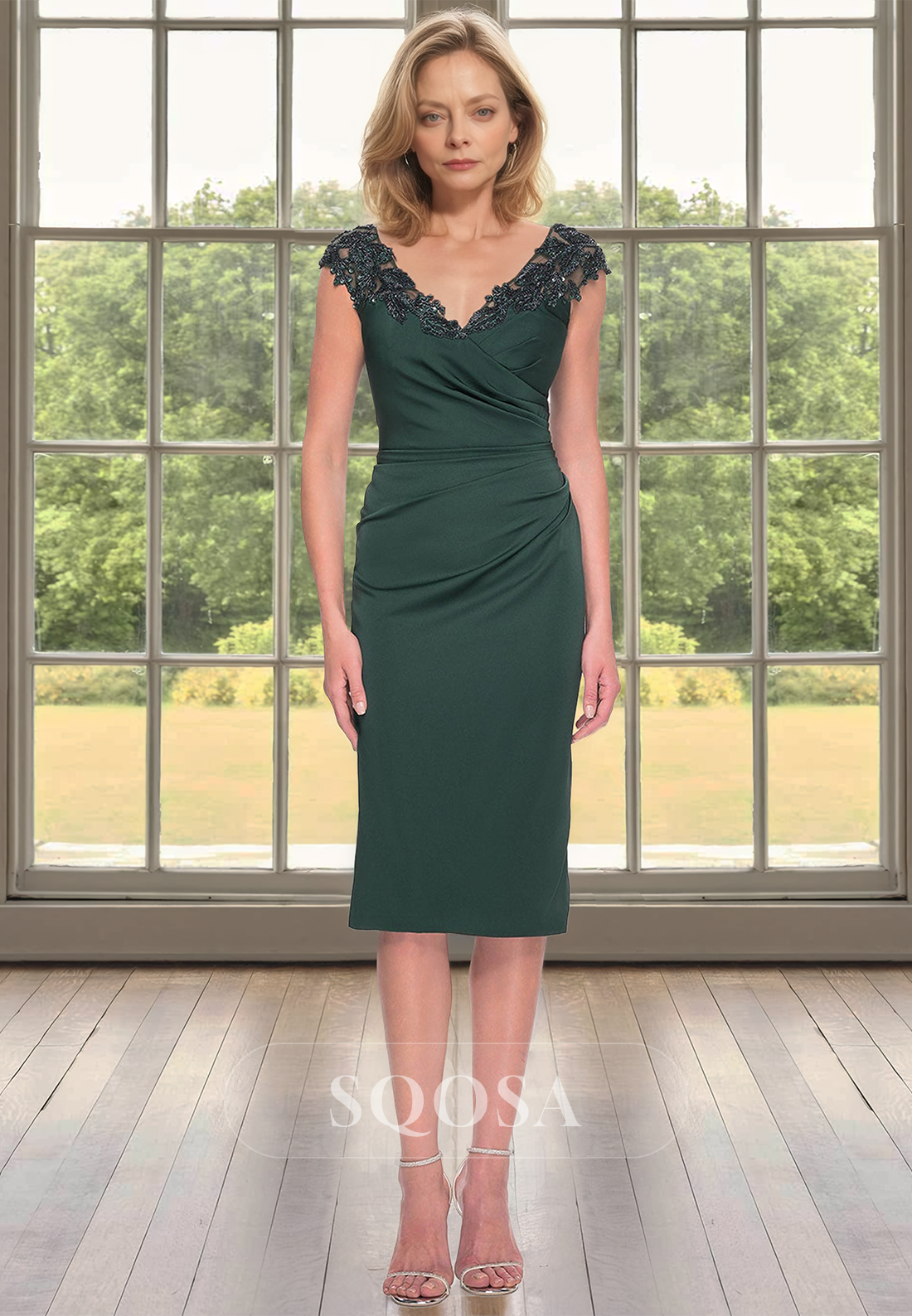 V-Neck Cap-Sleeves Applique Cocktail Gowns Beaded Pleated Midi Mermaid Mother of the Bride Dress