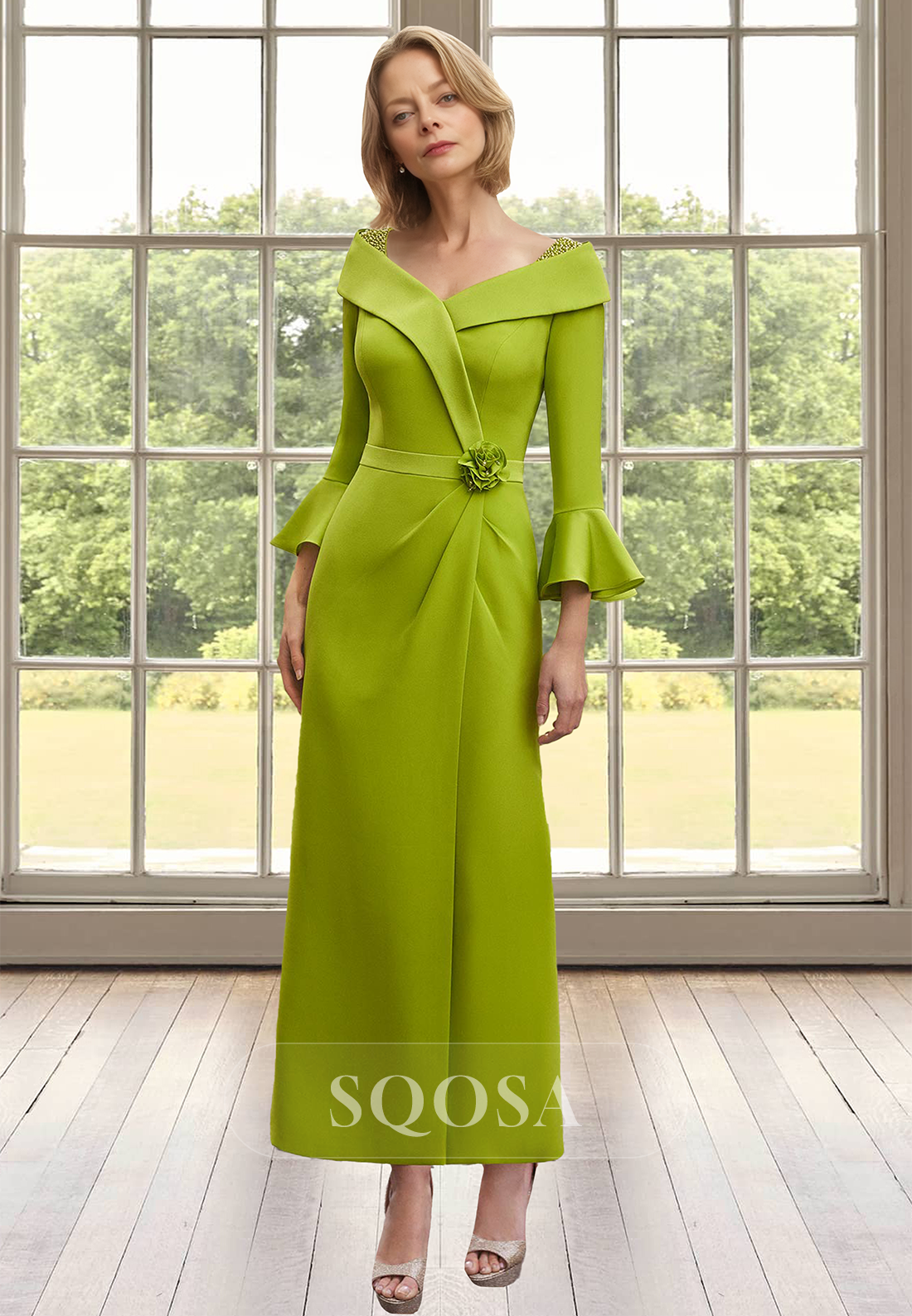 Bell-Long-Sleeves V-Neck Cocktail Gowns Satin Pleated Midi Mermaid Mother of the Bride Dress