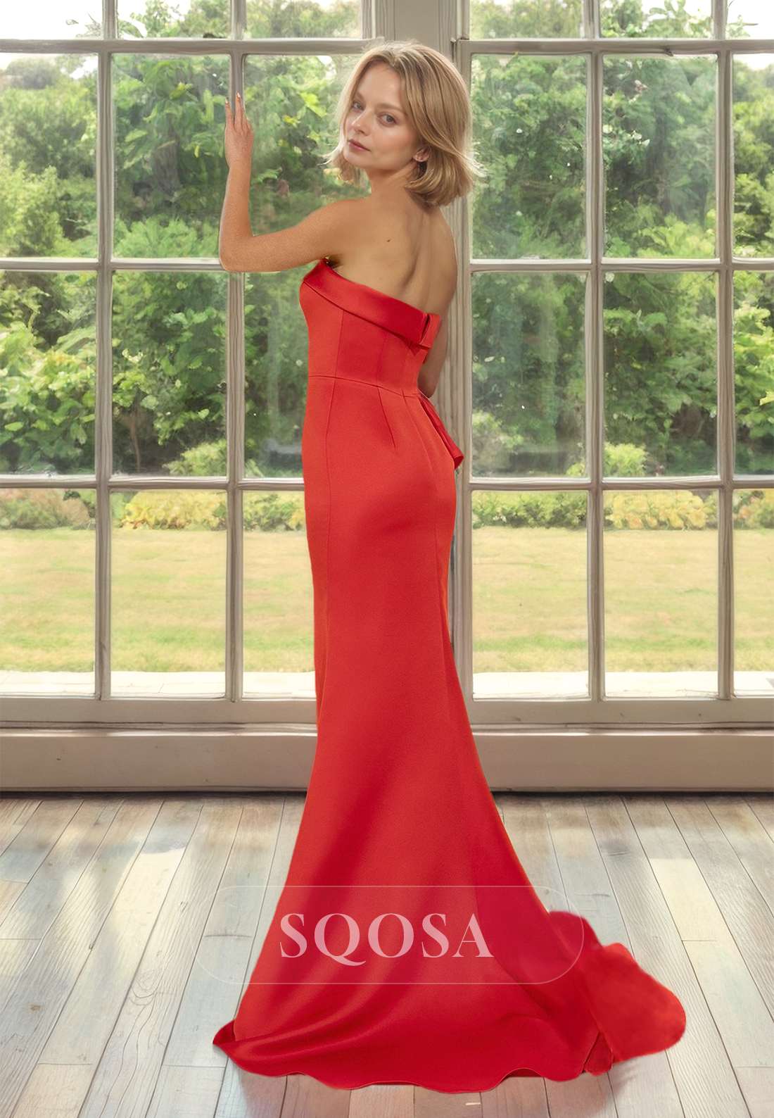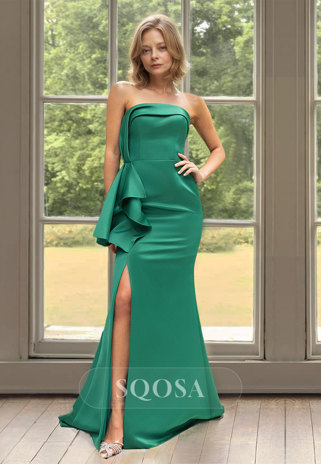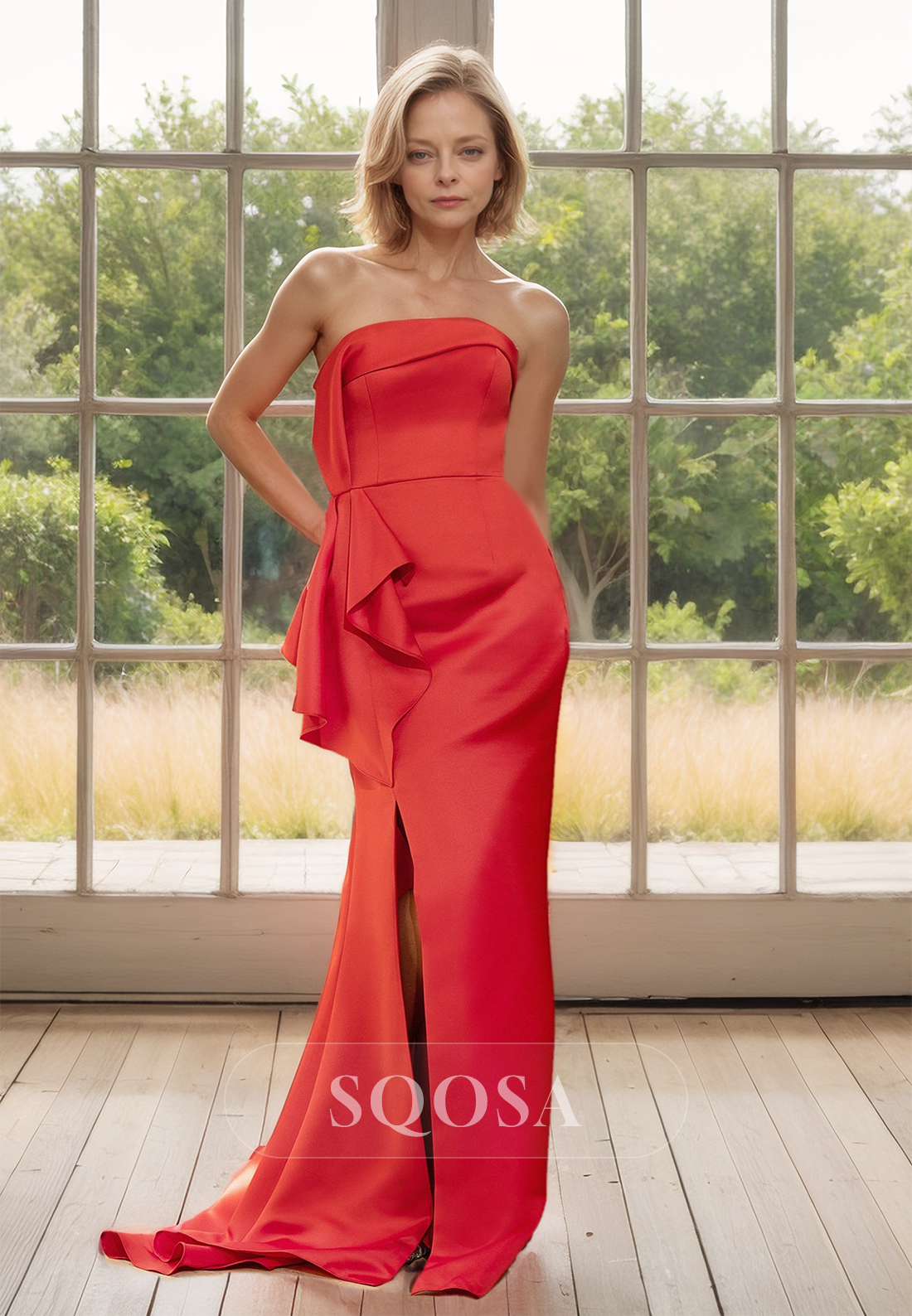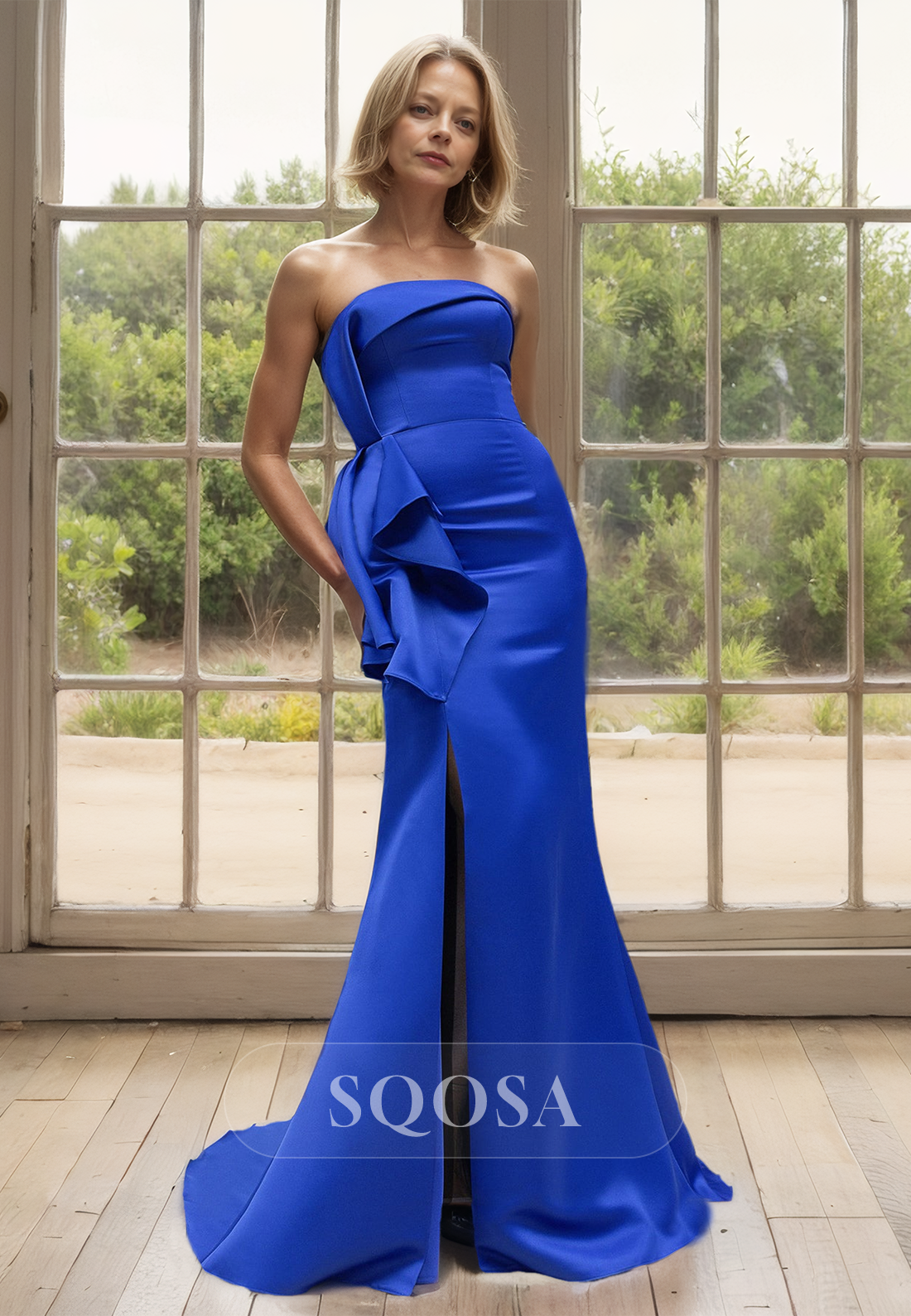 Sleeveless Tube Top SatinMermaid Mother of the Bride Dress Pleated Train Cocktail Gowns with Slit