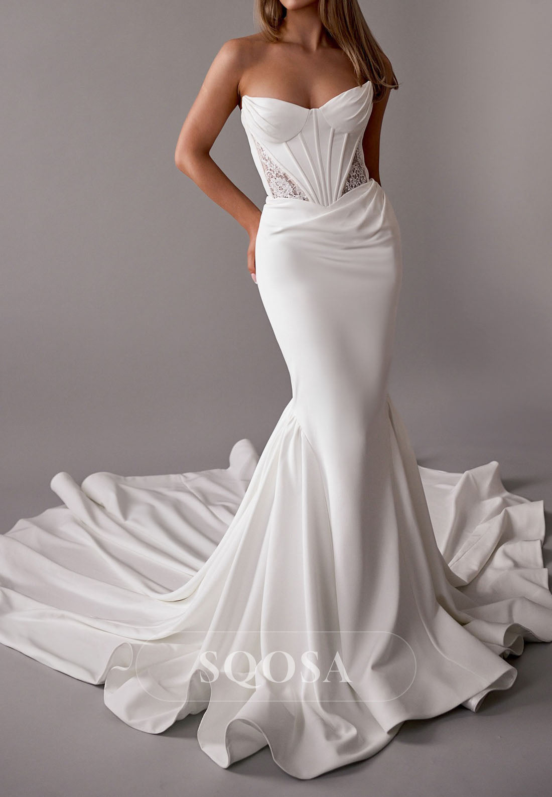 This beautiful sweetheart sleeveless wedding dress features an off-shoulder design with delicate pleats and a cutout back. The mermaid silhouette adds a touch of elegance, while the train adds a traditional and timeless element. Perfect for the modern bride looking for a romantic and sophisticated look on her special day.