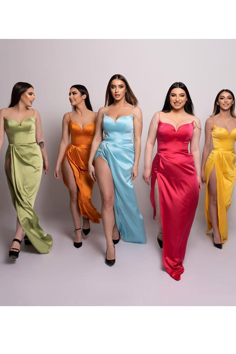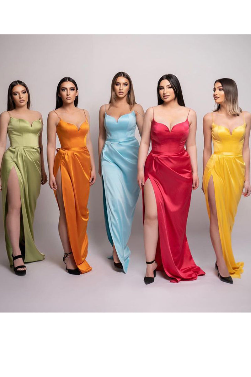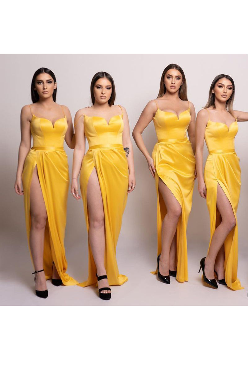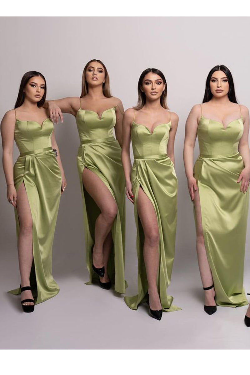 Sheath Spaghetti Straps Satin Pleated Split Long Bridesmaid Dress