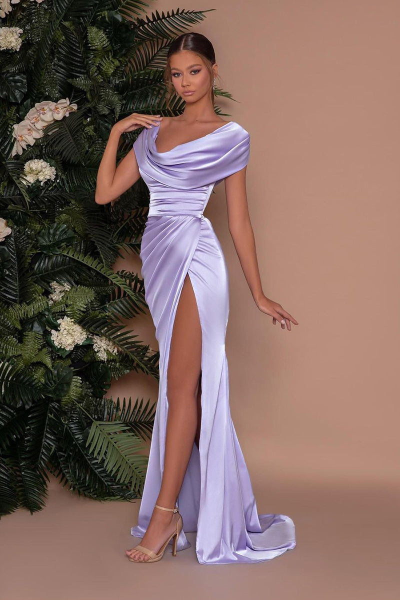 Sheath Satin Pleated Scoop Side Slit Lilac Long Bridesmaid Dress QB3084