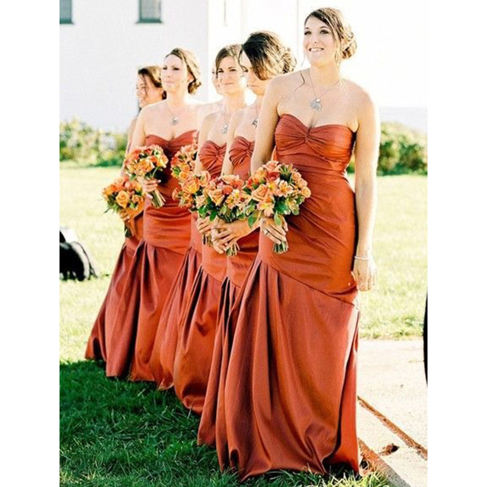 Rust Sweetheart Satin Pleated Long Bridesmaid Dress