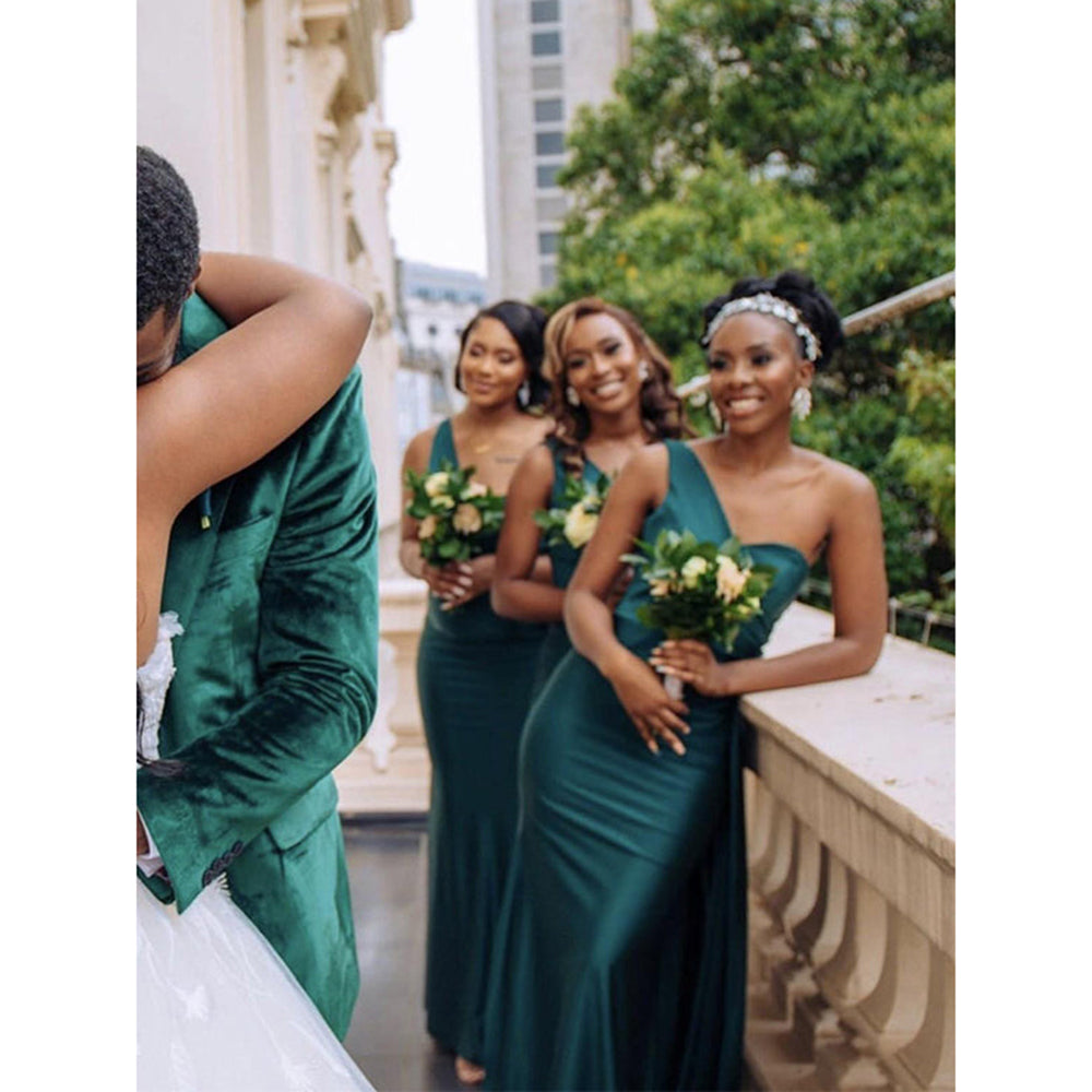 One Shoulder Satin Pleated Green Mermaid Bridesmaid Dress
