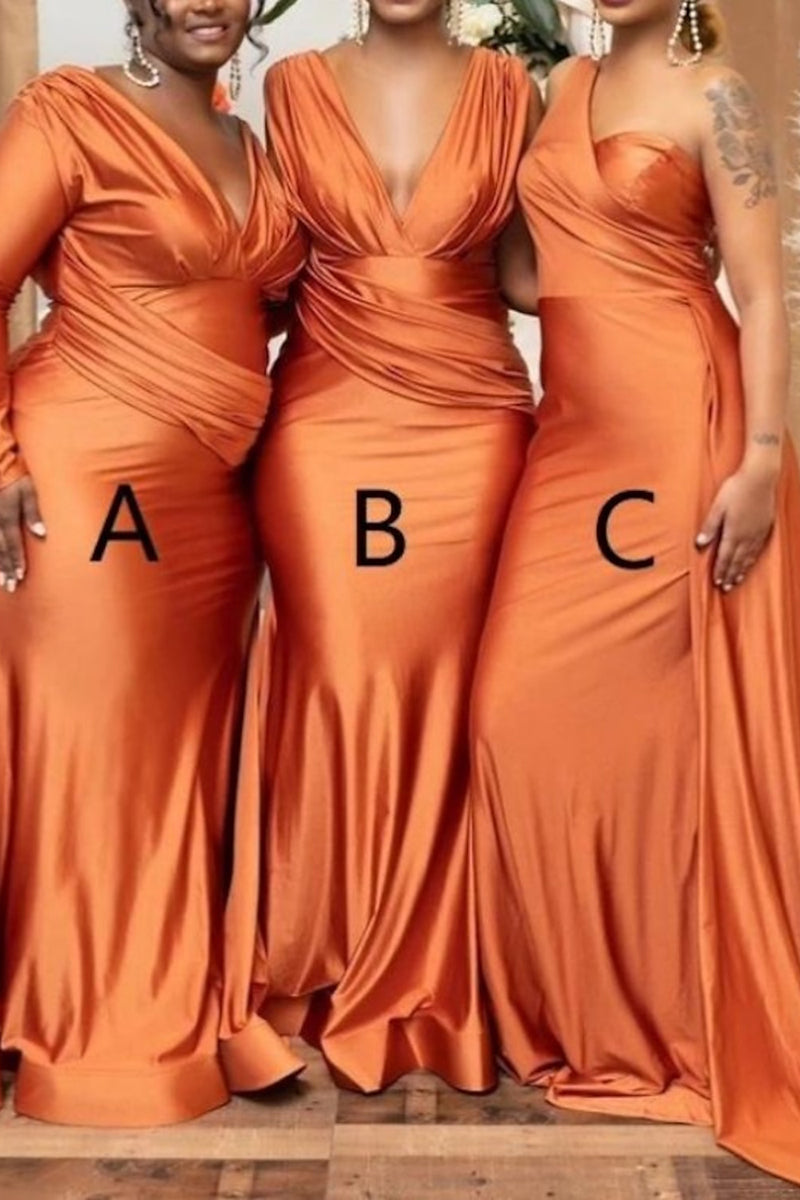 Mismatched Pleats Orange Mermaid Long Bridesmaid Dress for Black Girl QB3117