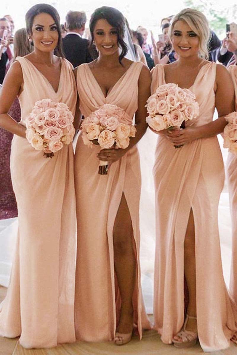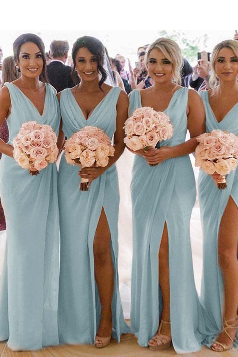 Sexy V Neck Pleats Side Slit Long Bridesmaid Dress