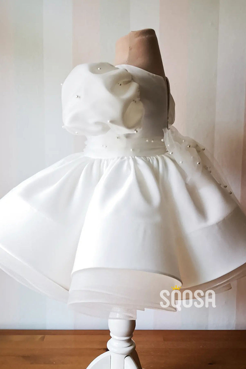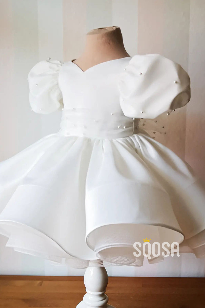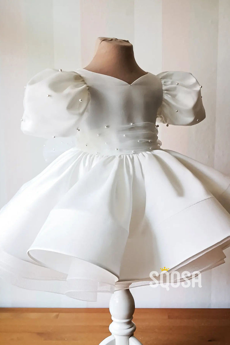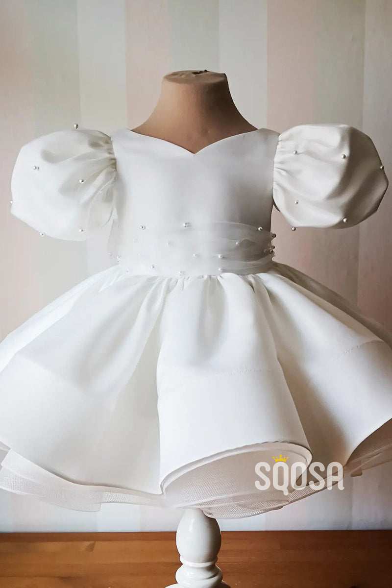 Ball Gown Short Sleeves Pearls Cute Ivory Flower Girl Dress First Communion Dress QF1012