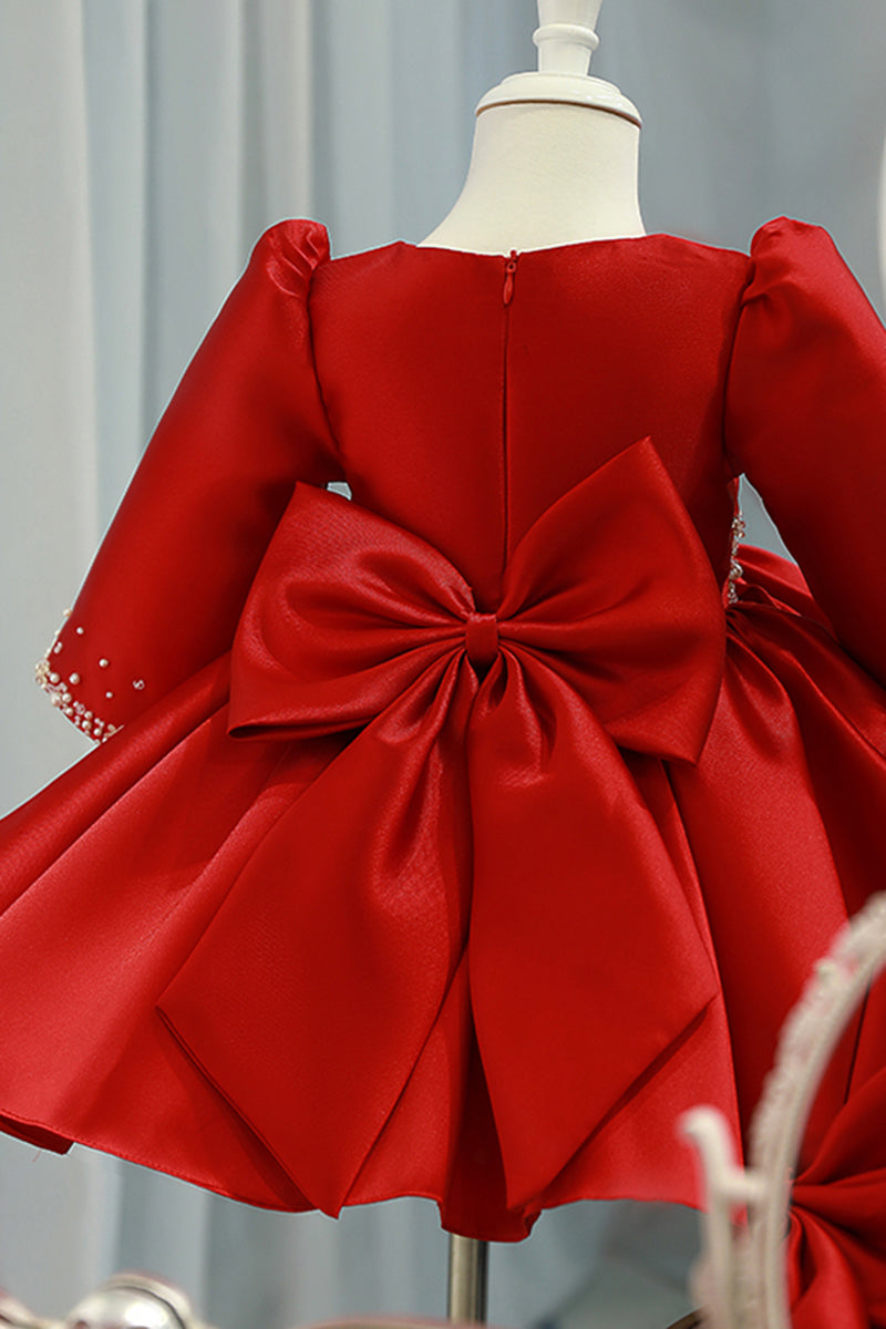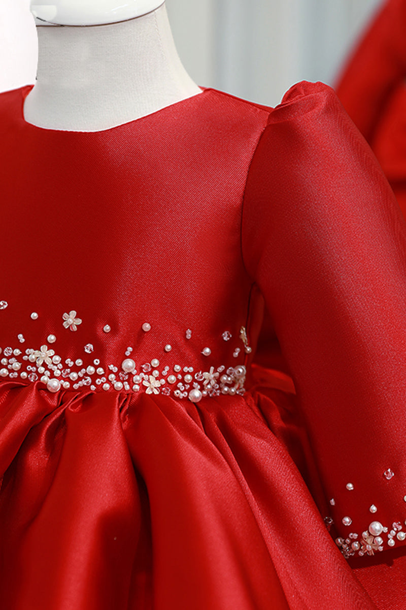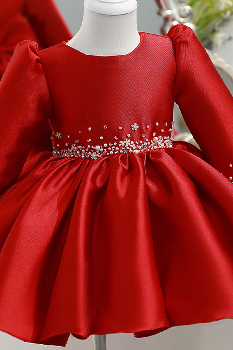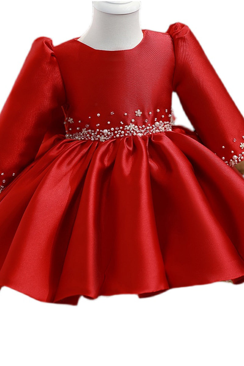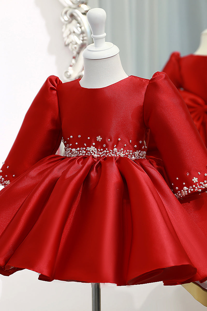 Ball Gown Red Satin Long Sleeves Flower Girl Dress Cute First Communion Dress