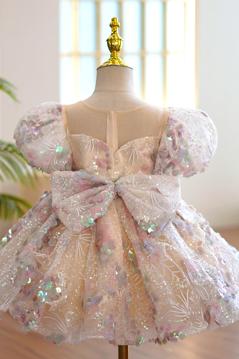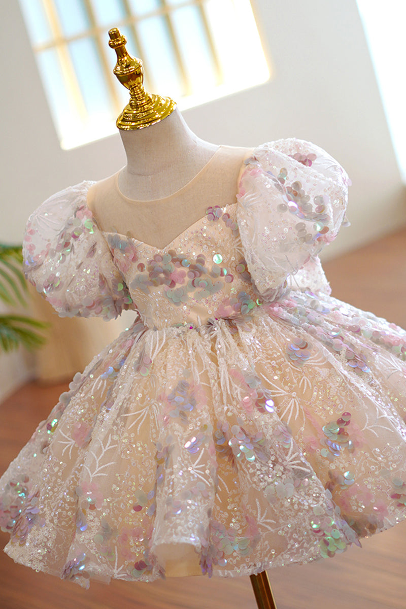 Illusion Neckline Short Sleeves Cute Flower Girl Dress Sparkly First Communion Dress