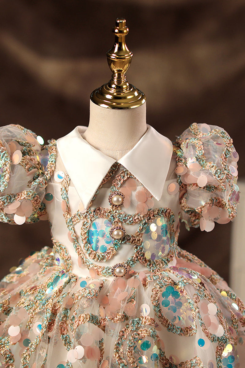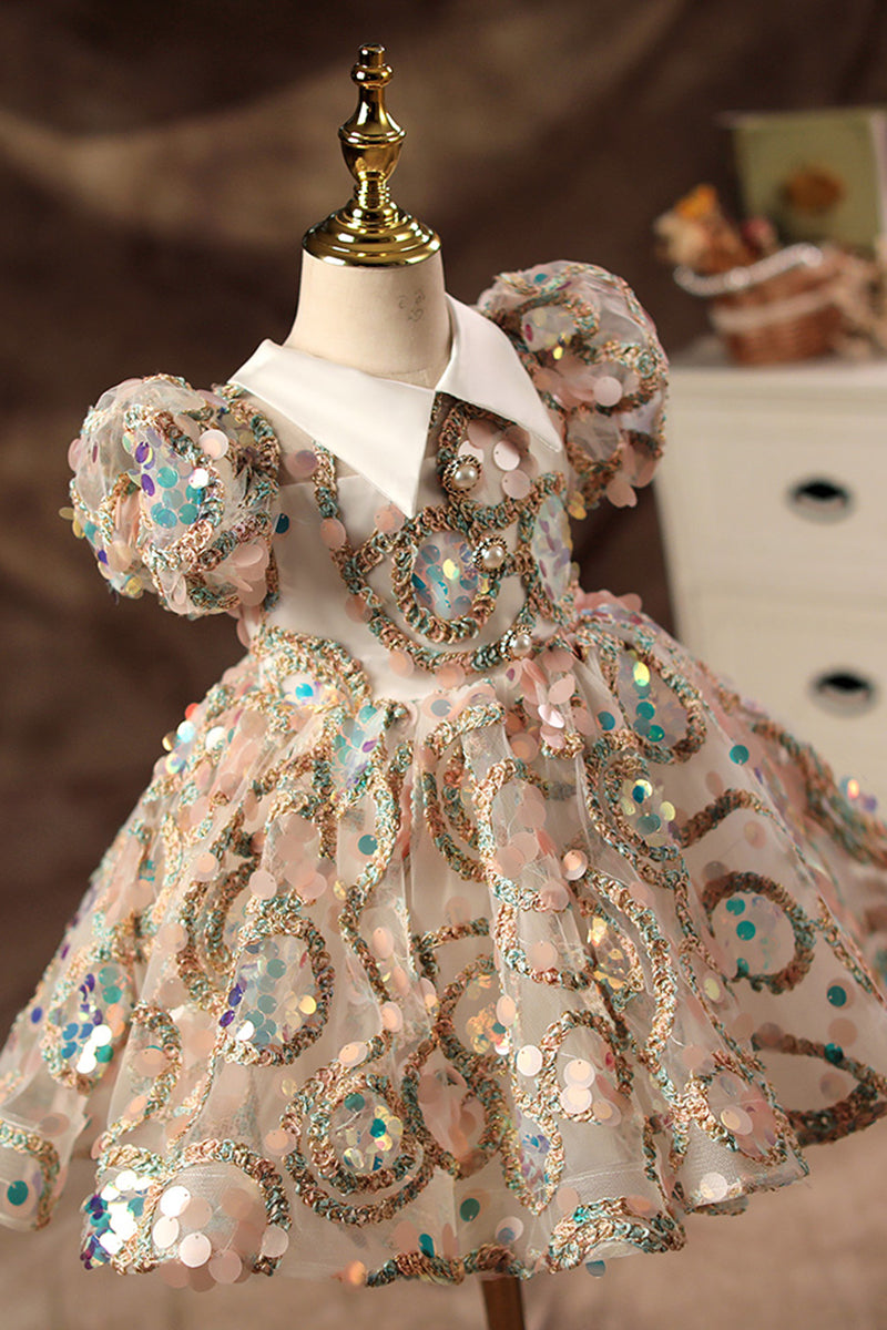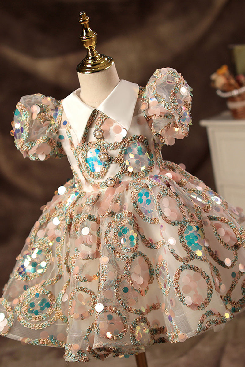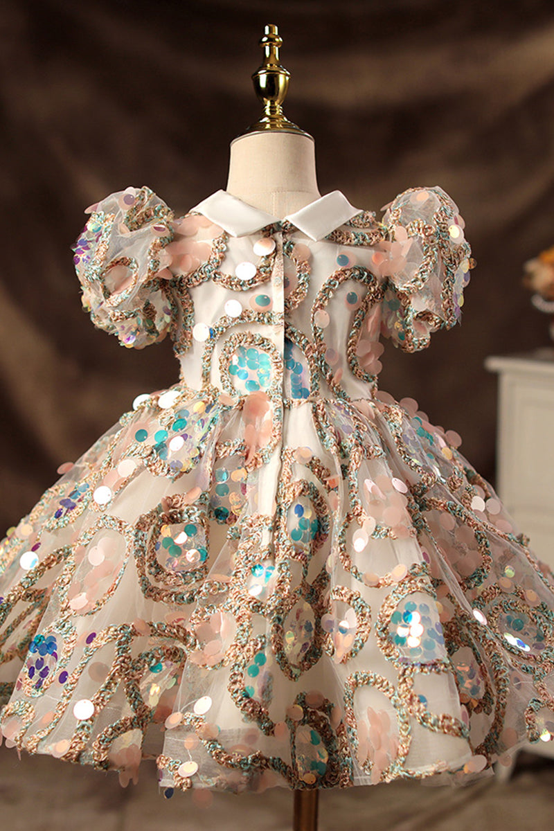 Unique High Neckline Short Sleeves Flower Girl Dress Cute First Communion Dress QF1039