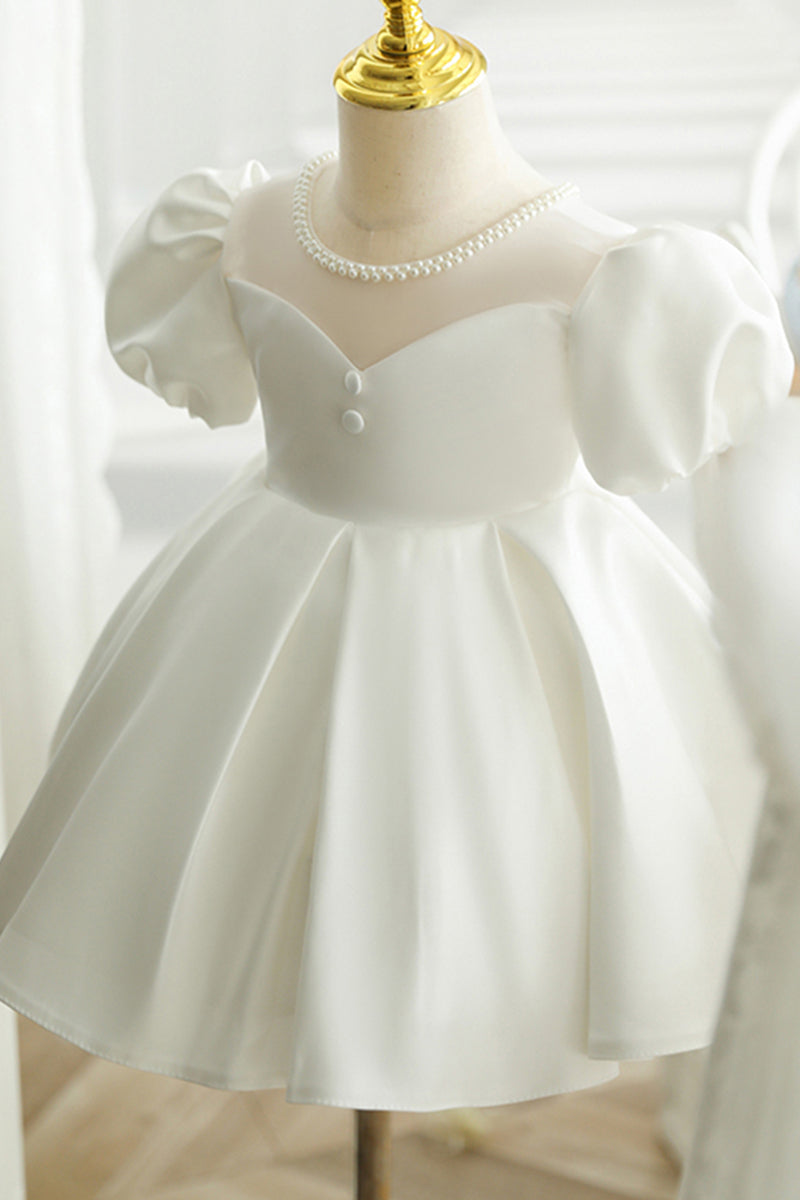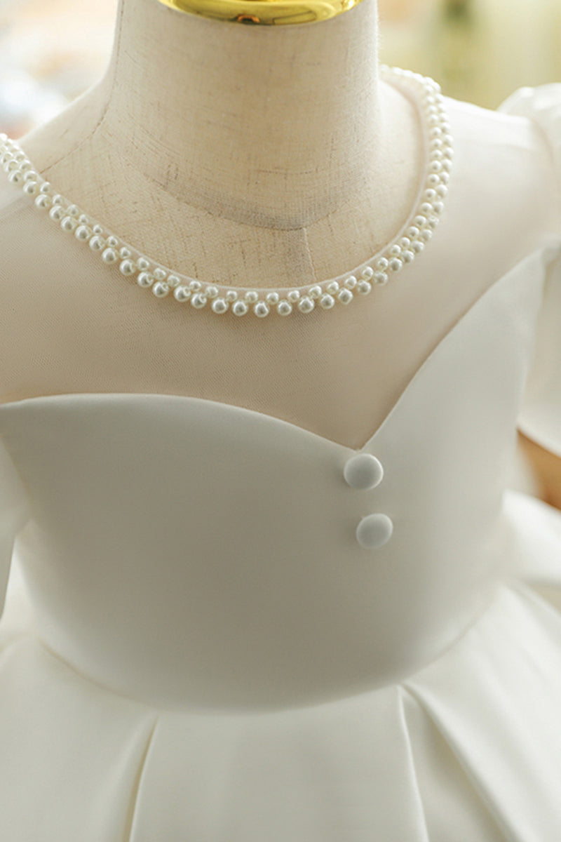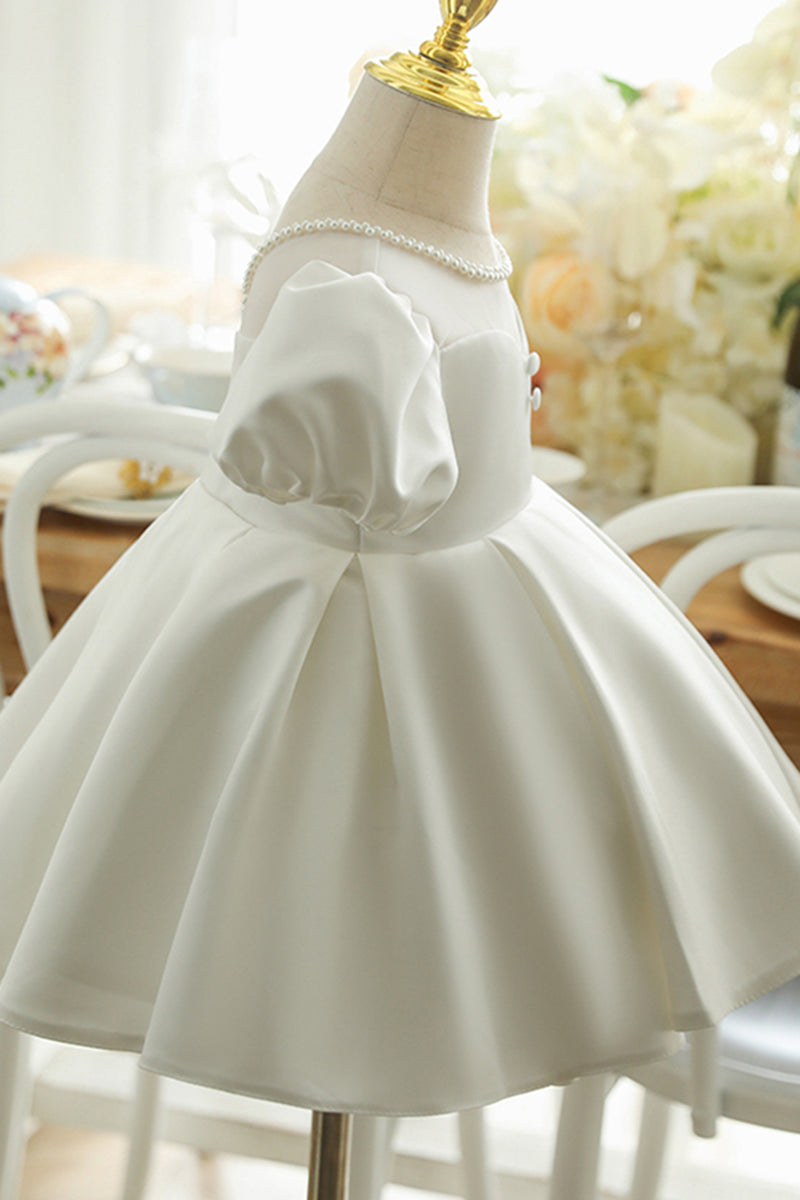 Ball Gown Illusion Neckline Pearls Cute Flower Girl Dress Short Sleeves First Communion Dress