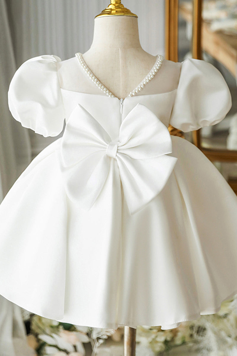 Ball Gown Illusion Neckline Pearls Cute Flower Girl Dress Short Sleeves First Communion Dress QF1042