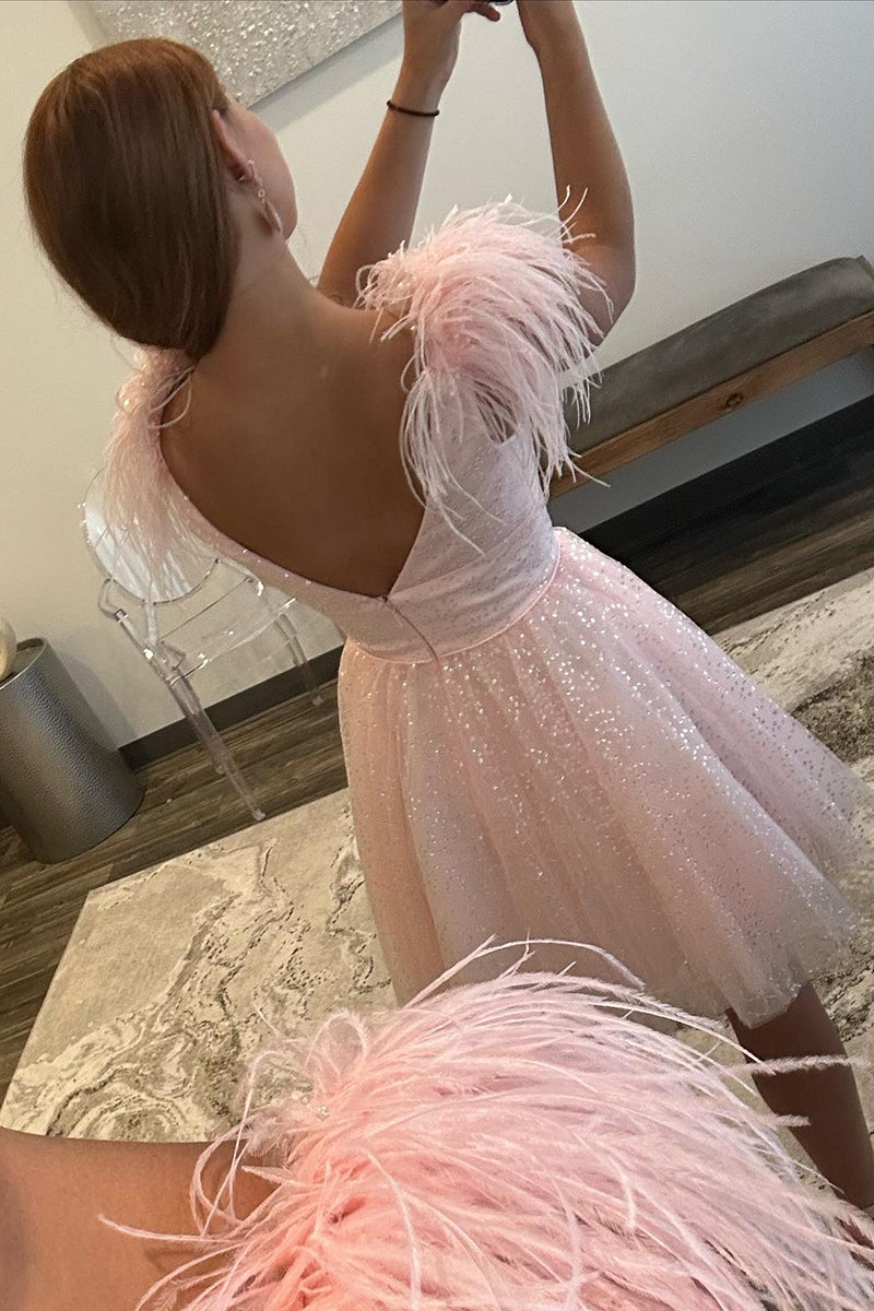 A Line V Neck Feathers Pink Cute Homecoming Dress QH2316