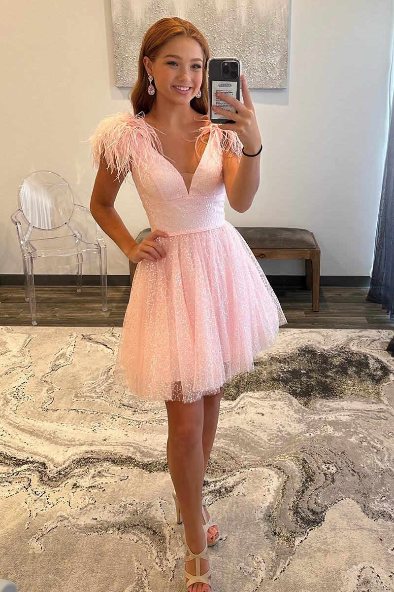 A Line V Neck Feathers Pink Cute Homecoming Dress