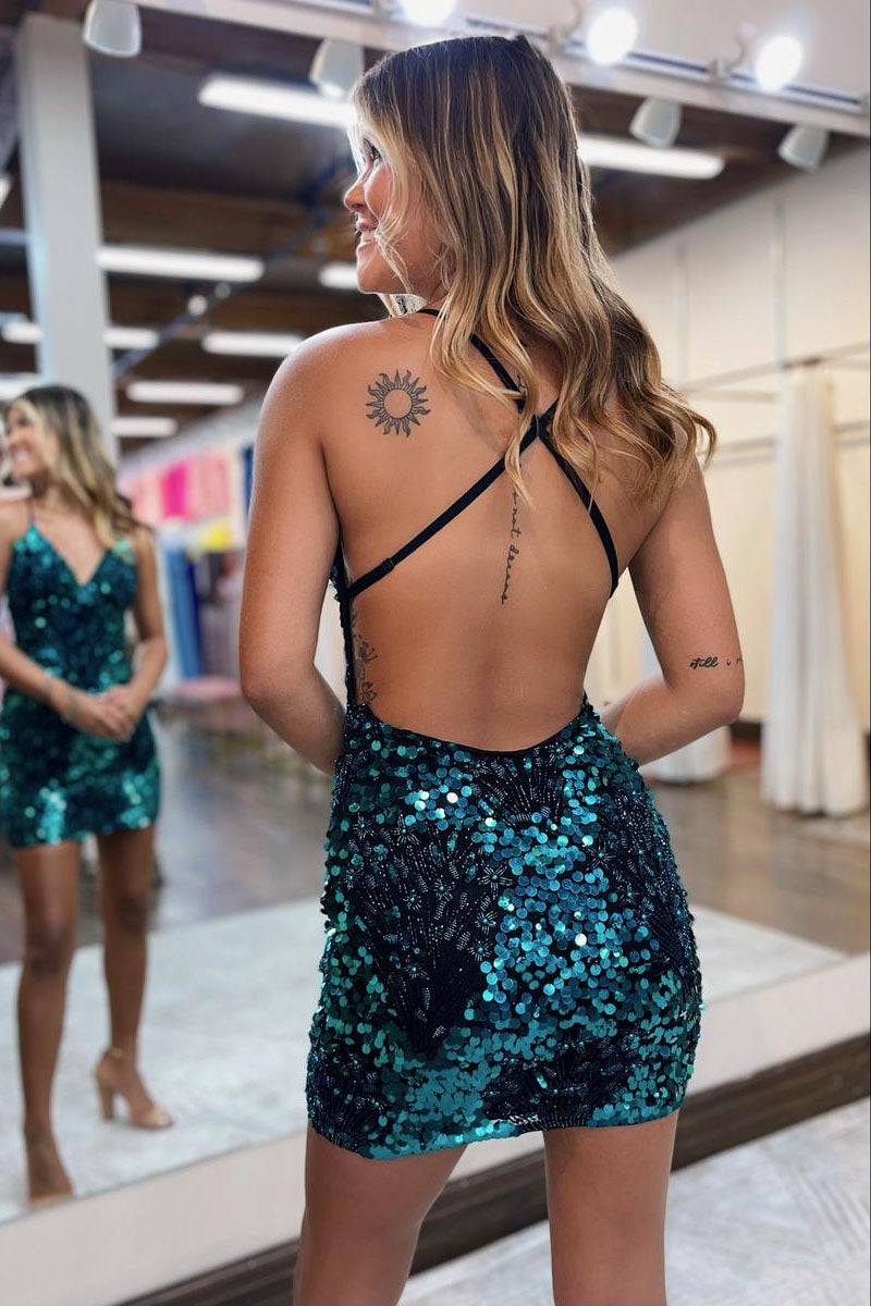 Sexy V Neck Fully Sequins Short Homecoming Dress Backless Short Graduation Dress