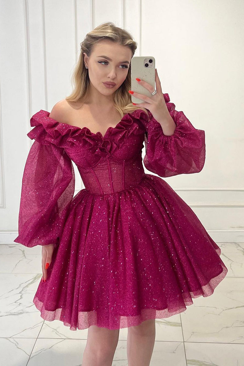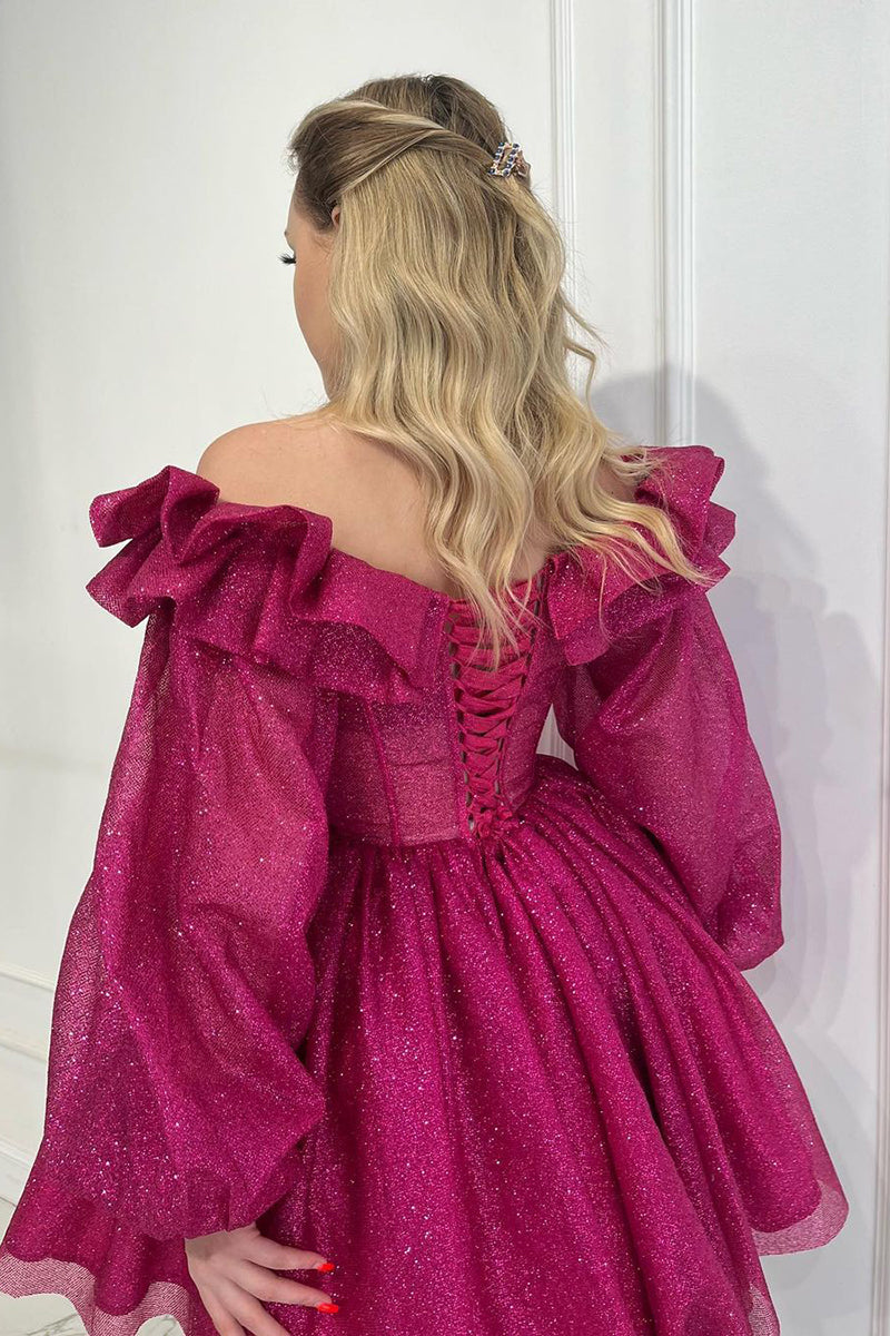 A Line Strapless Long Sleeves Sparkly Short Prom Dress Fuchsia Homecoming Dress