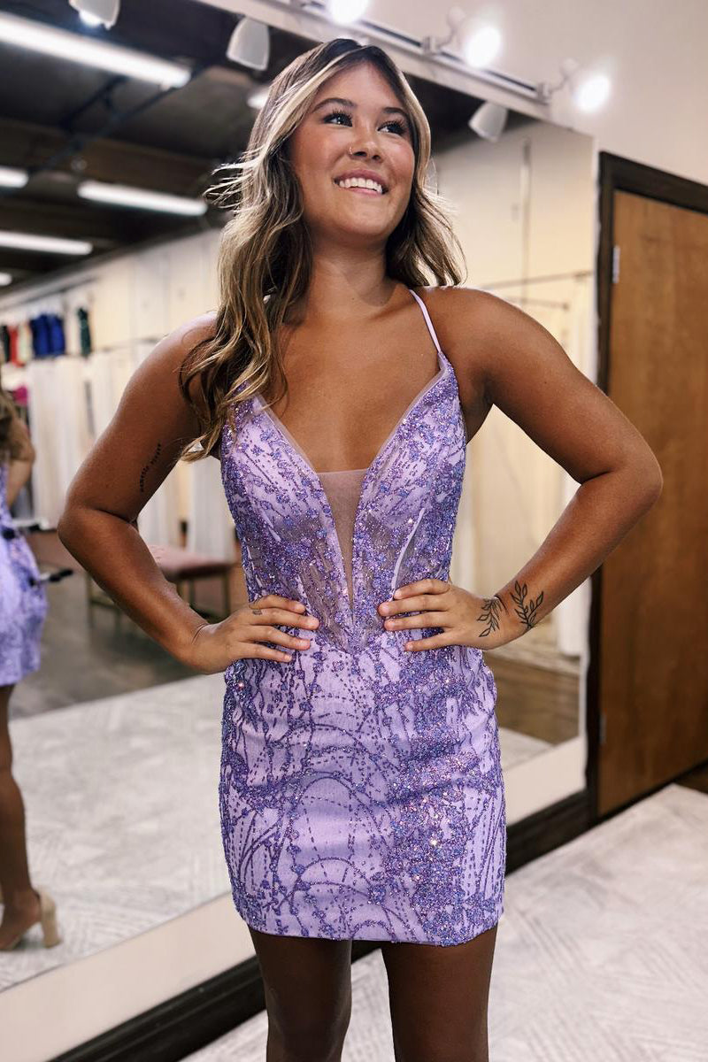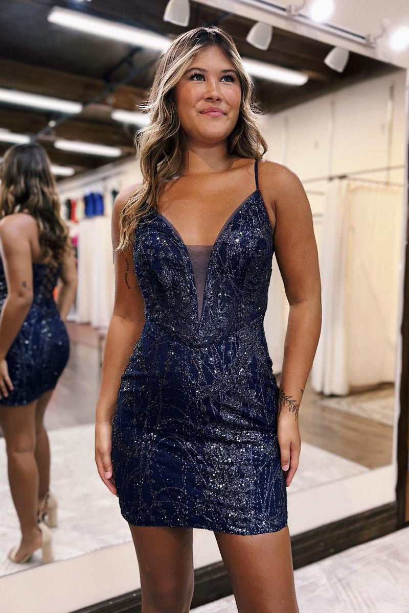 Sexy Deep V neck Sequins Lace Short Homecoming Dress