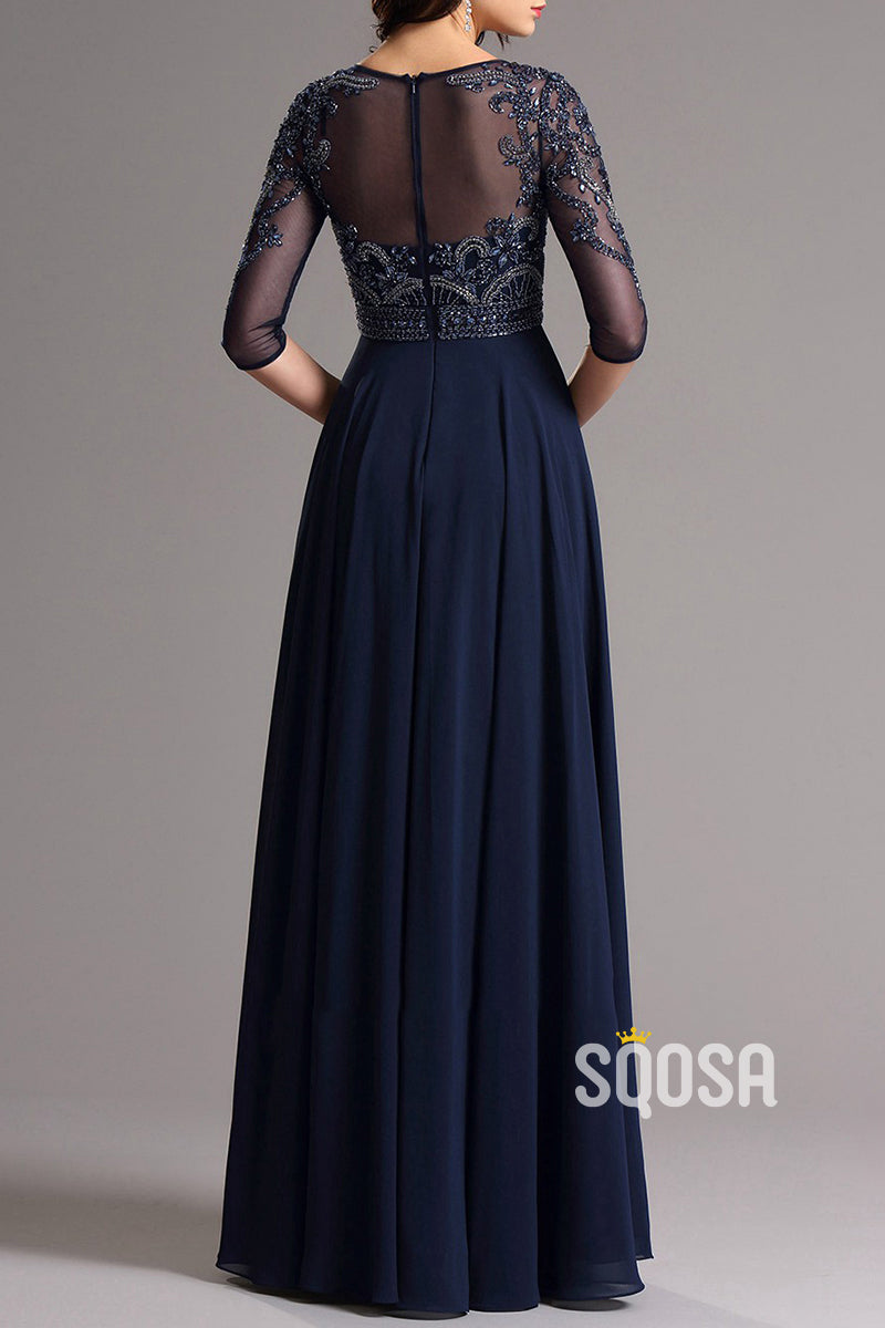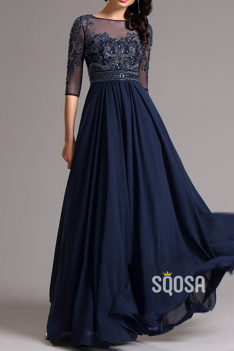 A-Line Round Chiffon Beaded Illusion Blue Mother of the Bride Dress QM3261