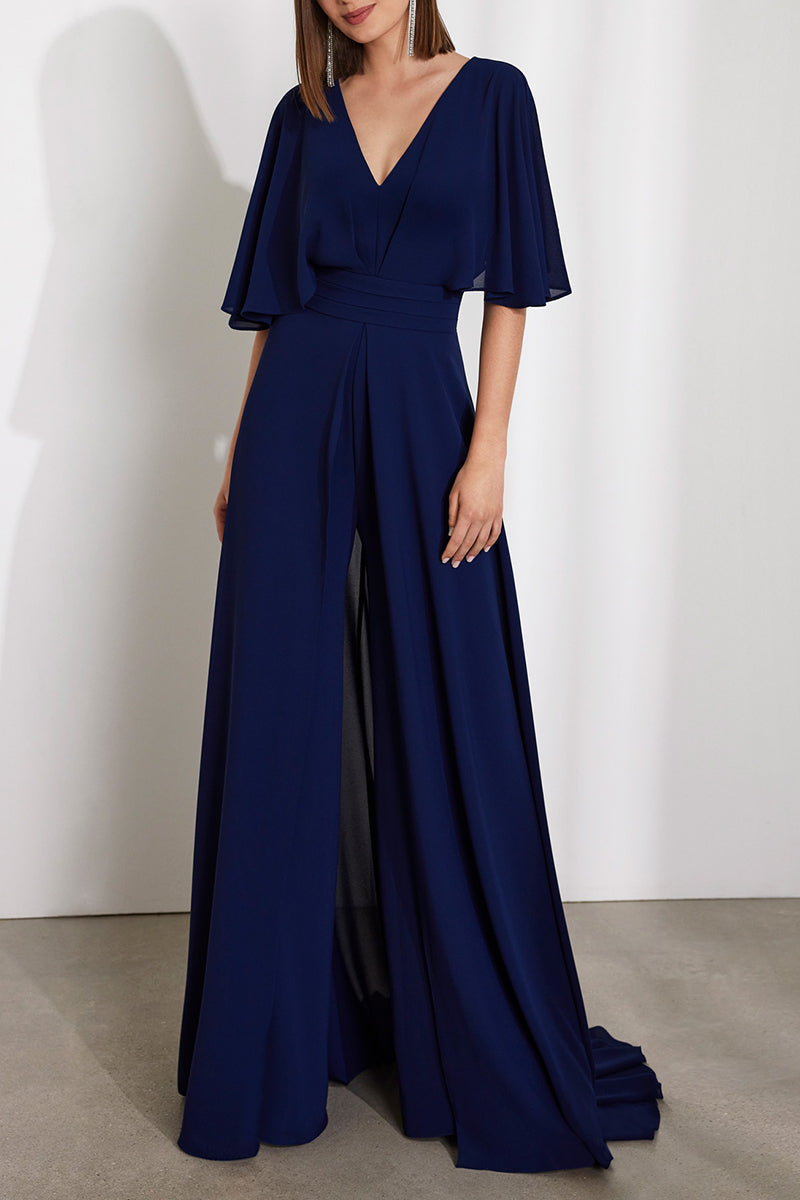 Chiffon A-Line V-Neck Half Sleeves With Train Cocktail Party Dress