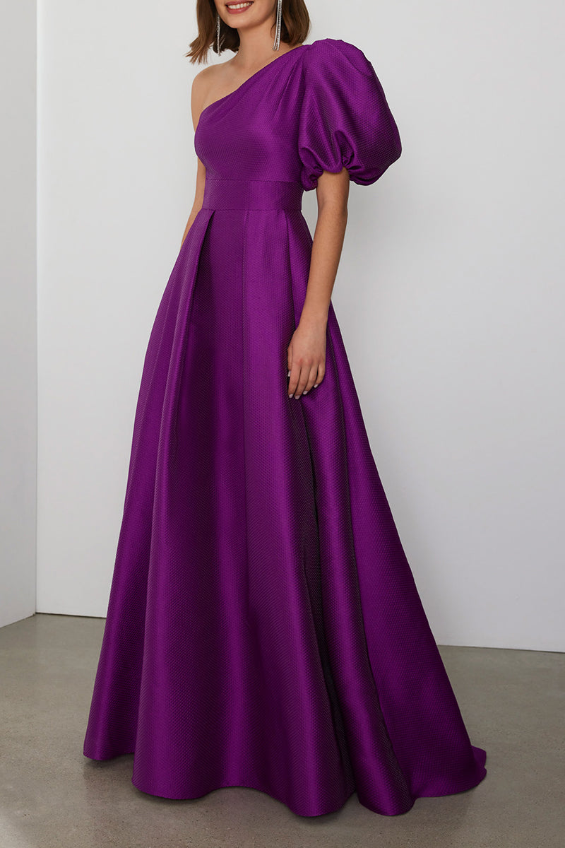 A-Line One Shoulder Puff Sleeves Empire Satin Cocktail Evening Dress QM3351