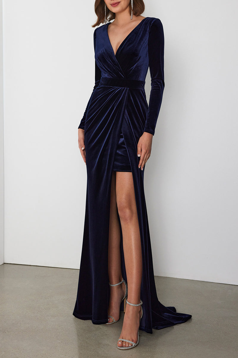 Classic & Timeless V-Neck Long Sleeve Pleats With Side Slit Formal Cocktail Dress