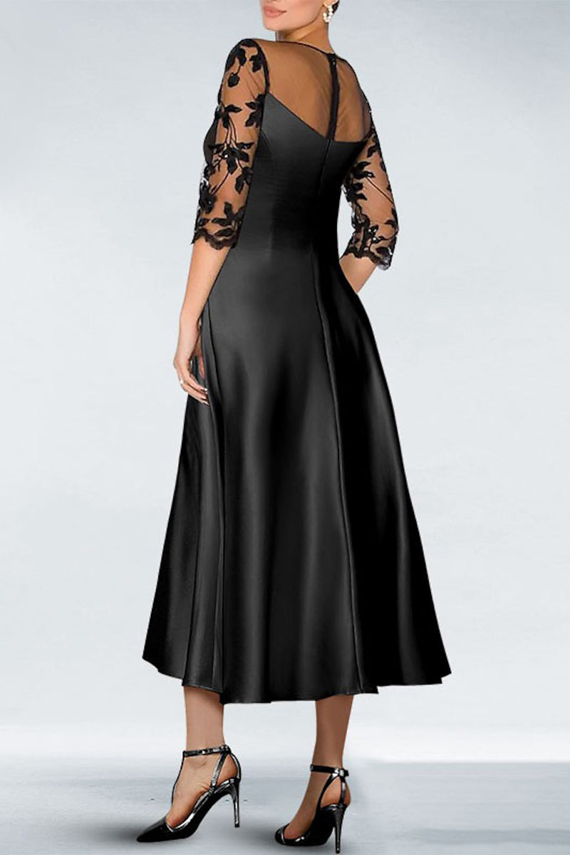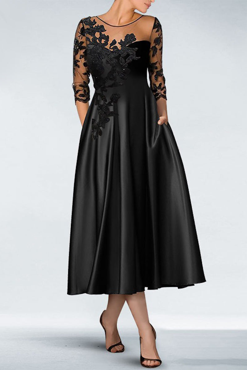 Chic Satin A-Line Round Half Sleeves Lace Applique Mother of the Bride Dress