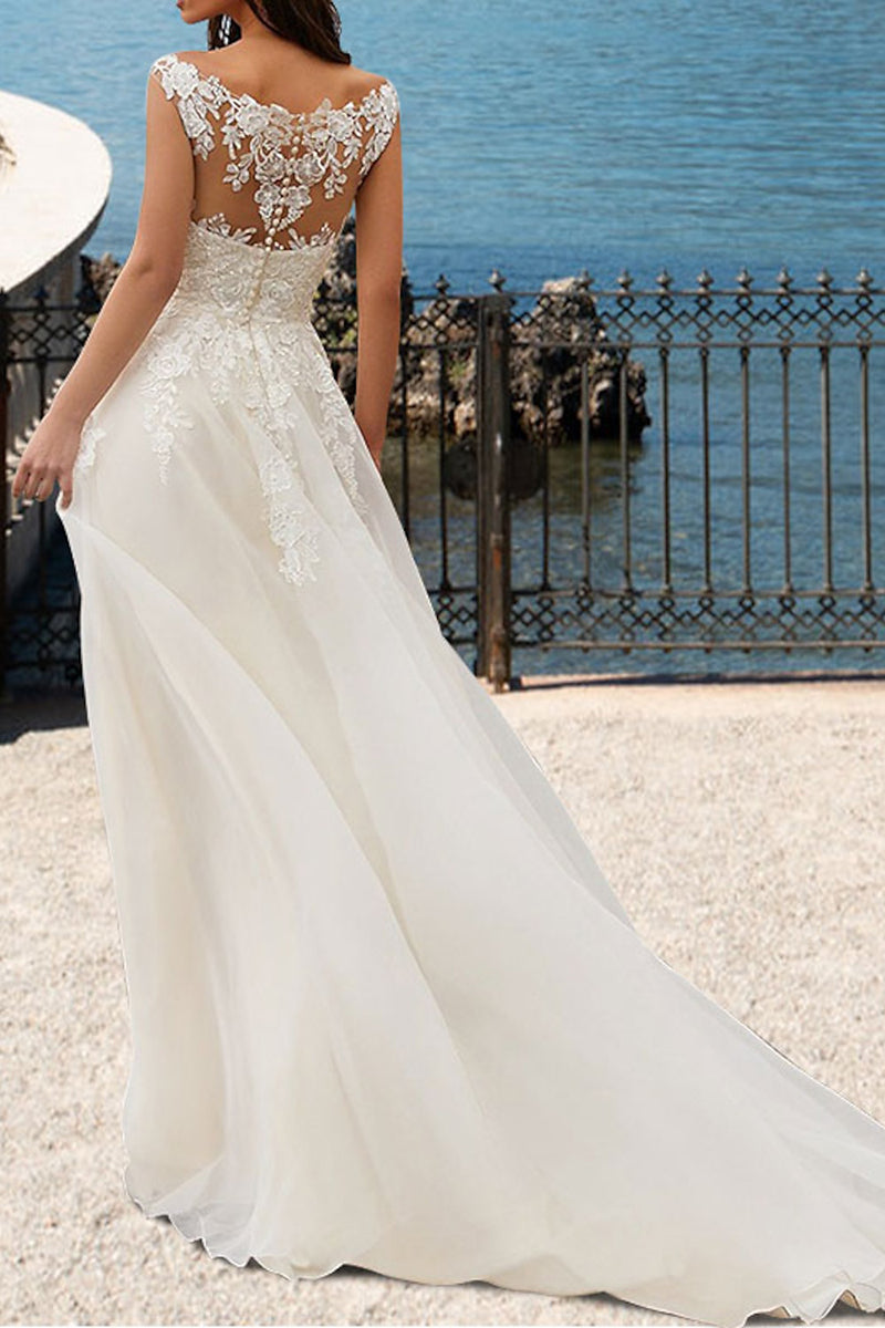 Beach Wedding Dress Court Train Lace Appliques A Line V Nec Summber Bridal Gown