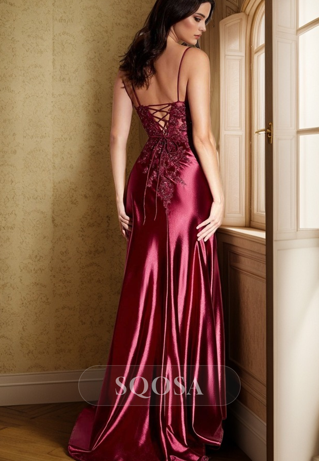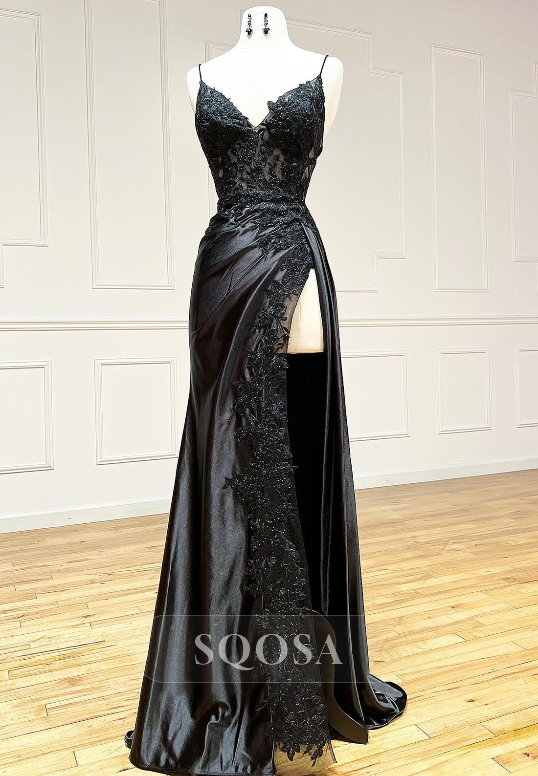 Elevate your style with our stunning Spaghetti Straps Lace Appliques Side Slit Black Long Prom Dress. Designed with intricate lace appliques and a side slit, this dress will make you stand out at any prom or formal event. Made with quality materials for a comfortable fit all night long.