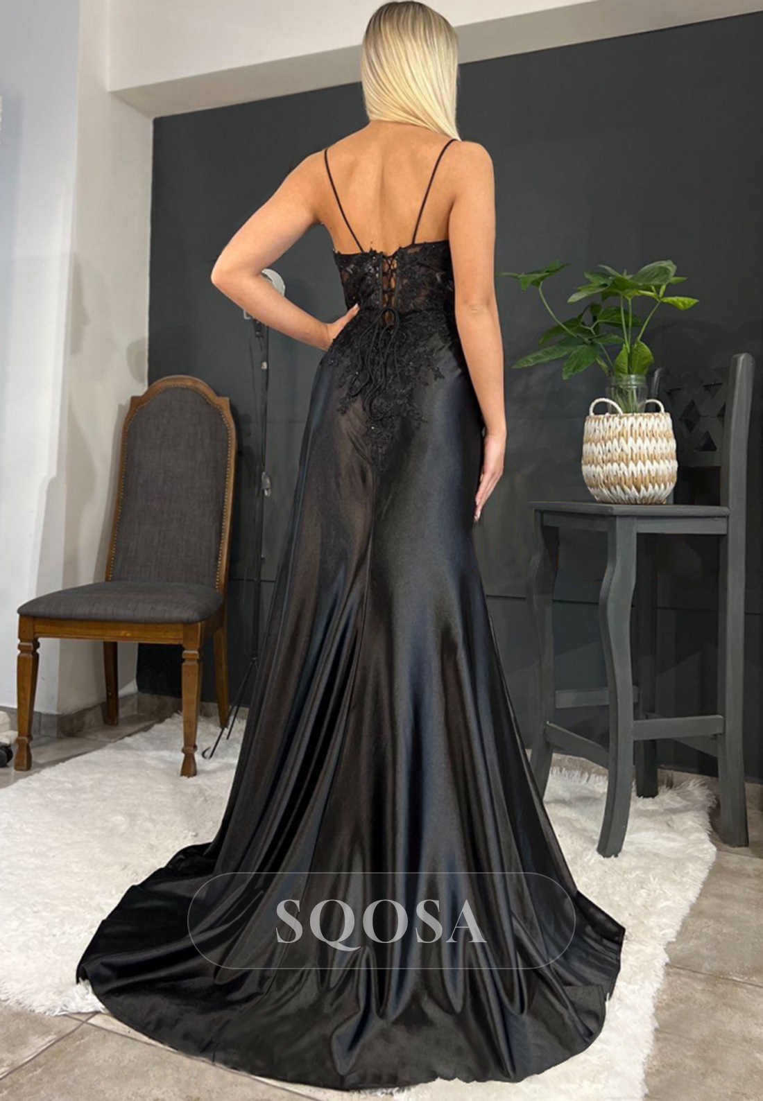 Spaghetti Straps Lace Appliques Side Slit Black Long Prom Dress