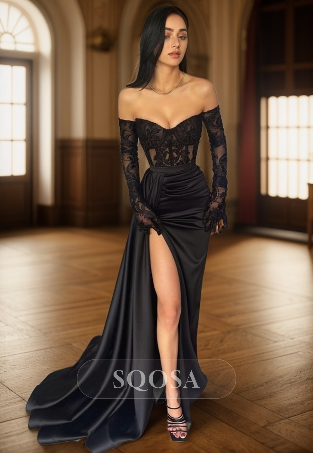 Sheath Sweetheart Satin Pleated Lace Appliques Black Log Prom Formal Dress