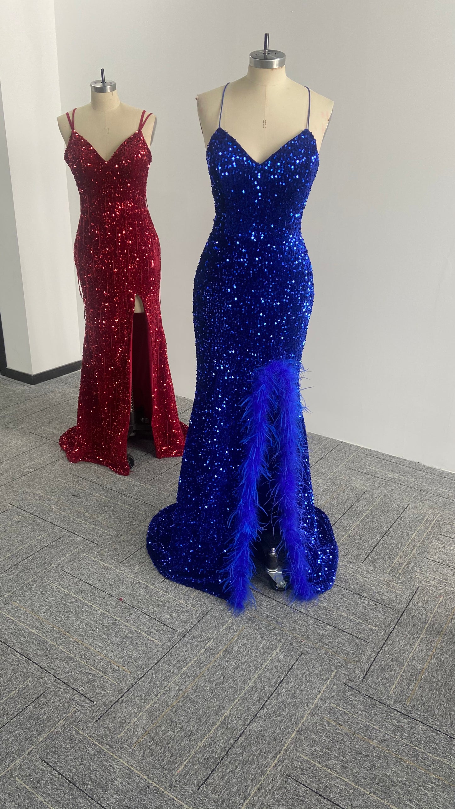 Spaghetti Straps Side Slit Feather Sparkly Prom Dress QP3019 x 1;