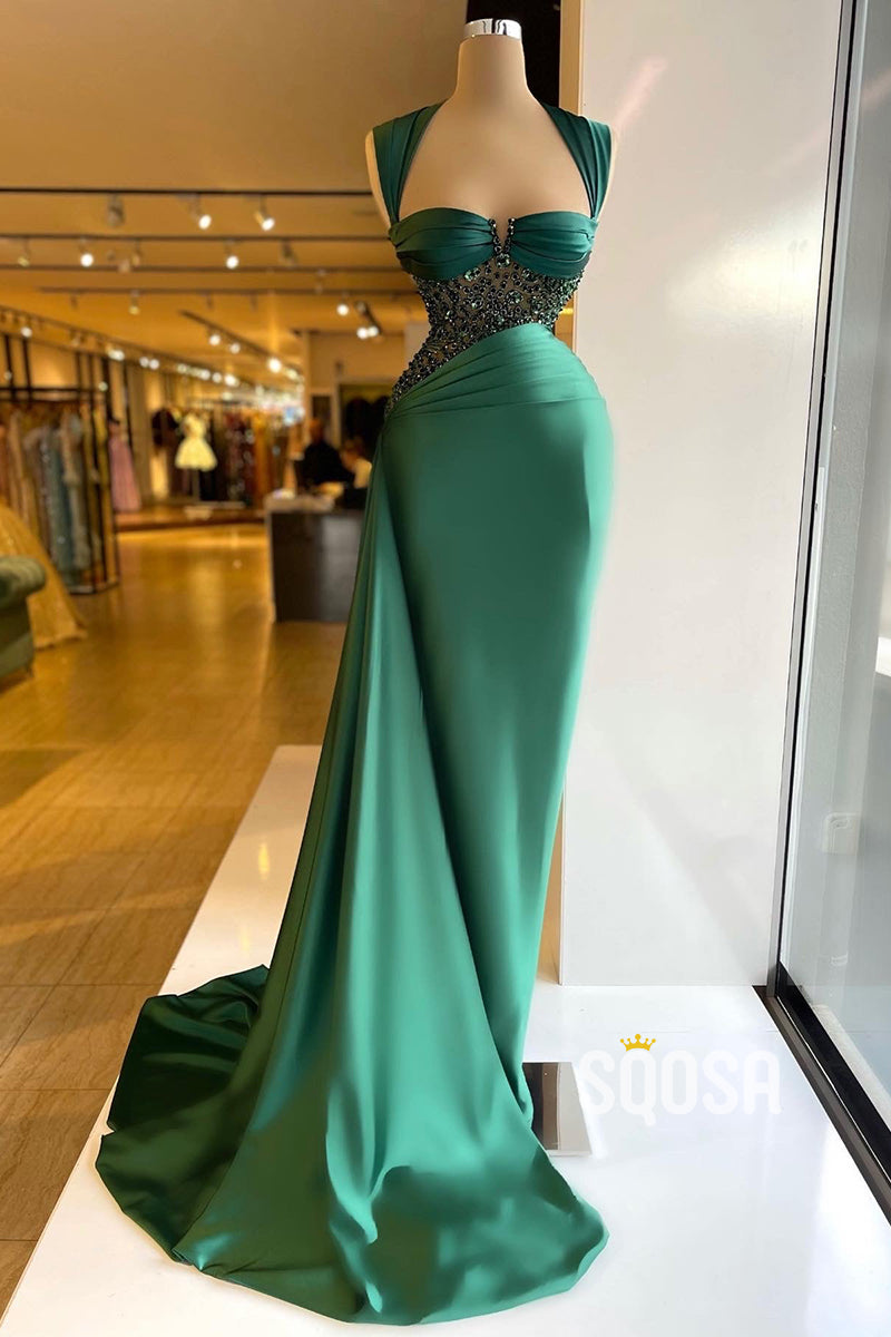 Chic & Modern Straps Green Beaded Pleats Prom Dress Evening Gown QP3128