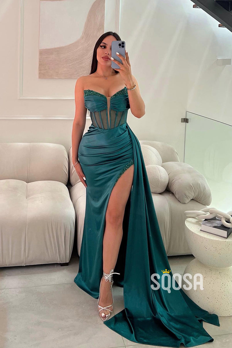 Chic & Modern Strapless Beaded Pleats Long Prom Dress Evening Gown