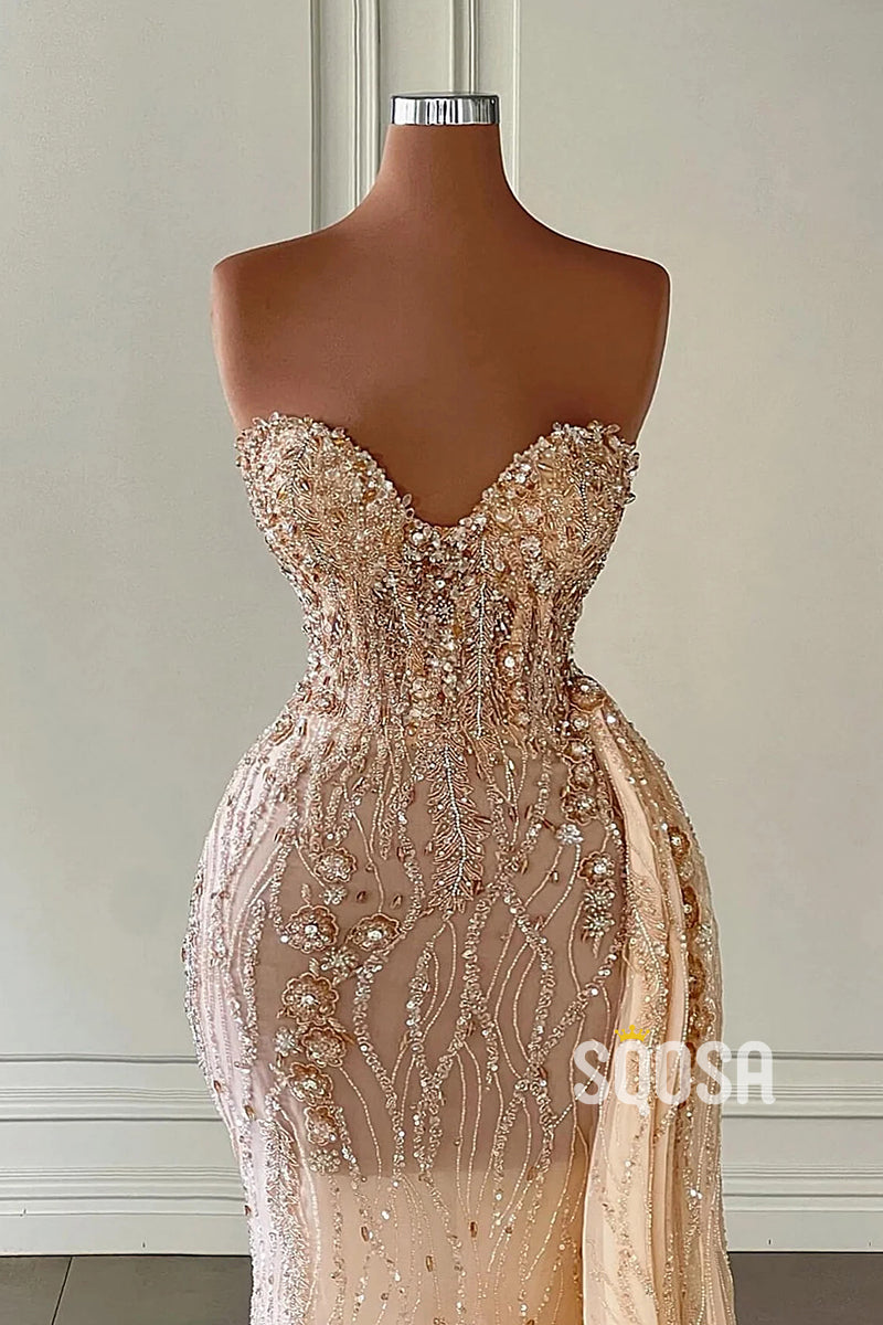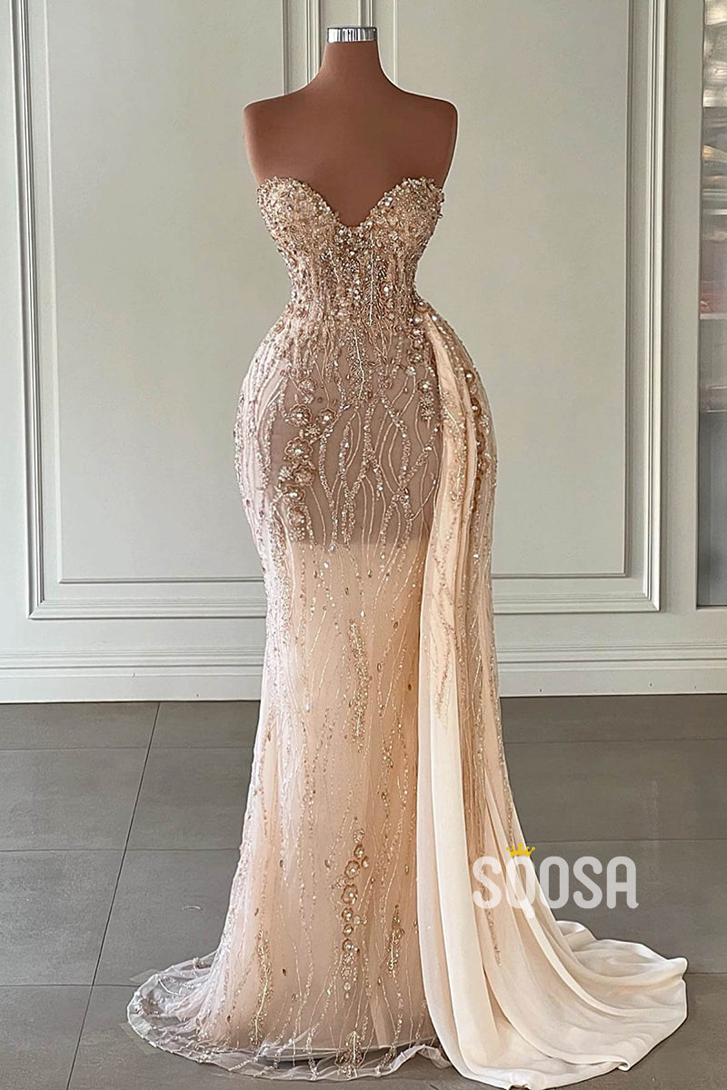 Luxurious Strapless Illusion Beaded Champagne Long Prom Dress Evening Gowns QP3167